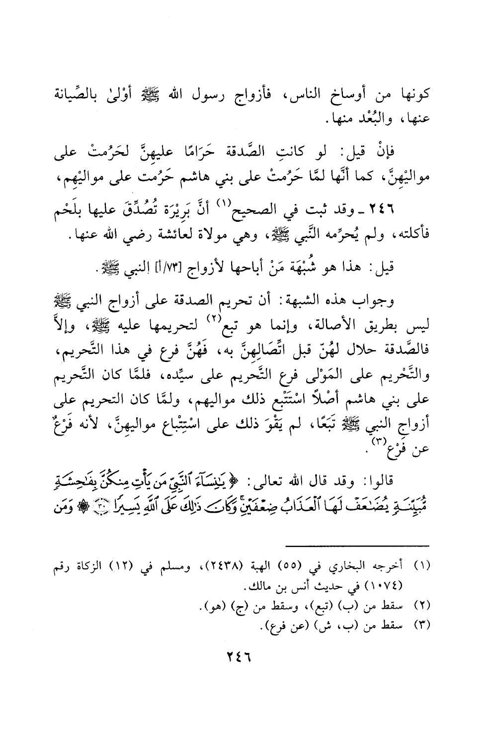 وجواب هذه الشبهة: أن تحريم الصدقة على أزواج النبي!