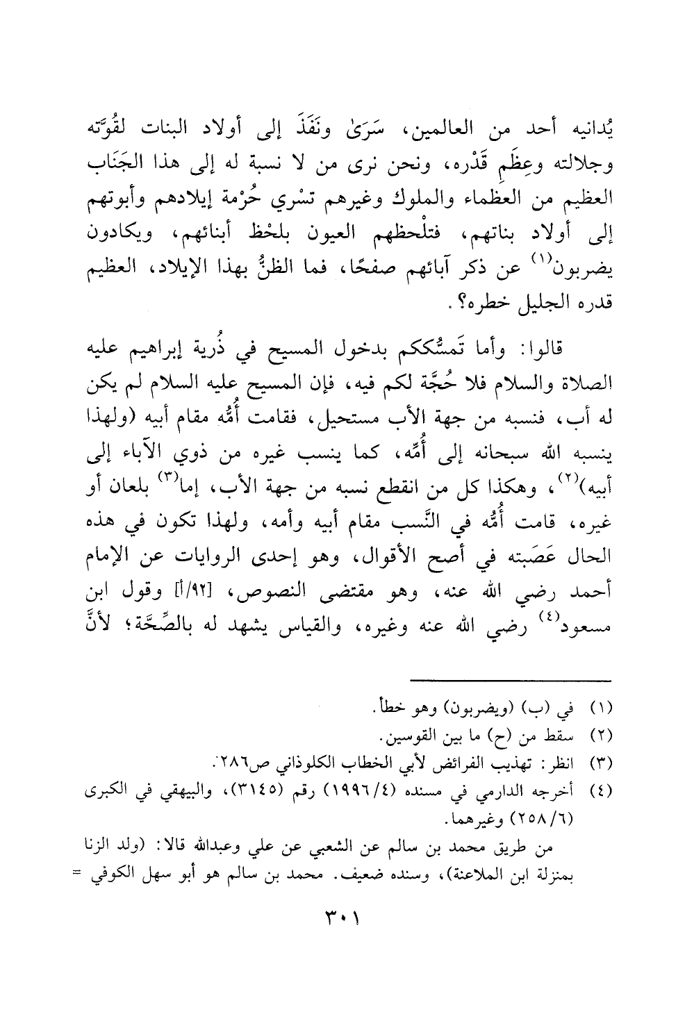 قالوا: وأما تمسككم بدخول المسيح في ذرية إبراهيم عليه