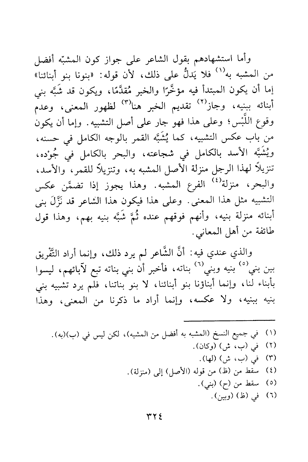من المشبه به (1) فلا يدل على ذلك، لان قوله: "بنونا بنو أبنائنا"