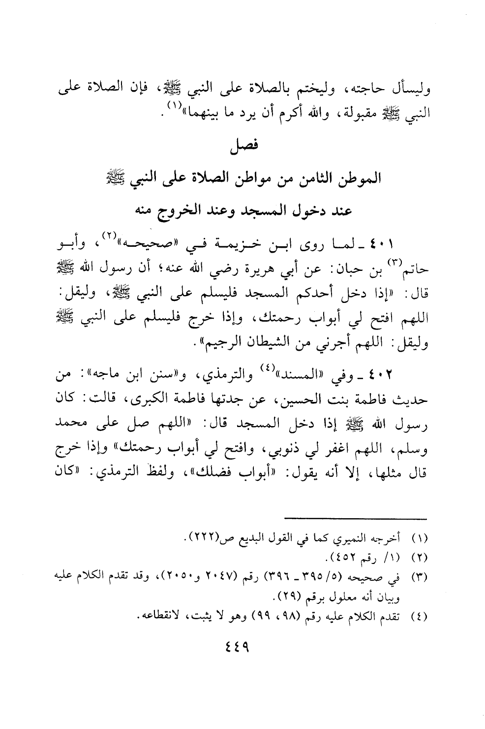 فصل الموطن الثامن من مواطن الصلاة على النبي صلى الله عليه وسلم عند دخول المسجد وعند الخروج منه