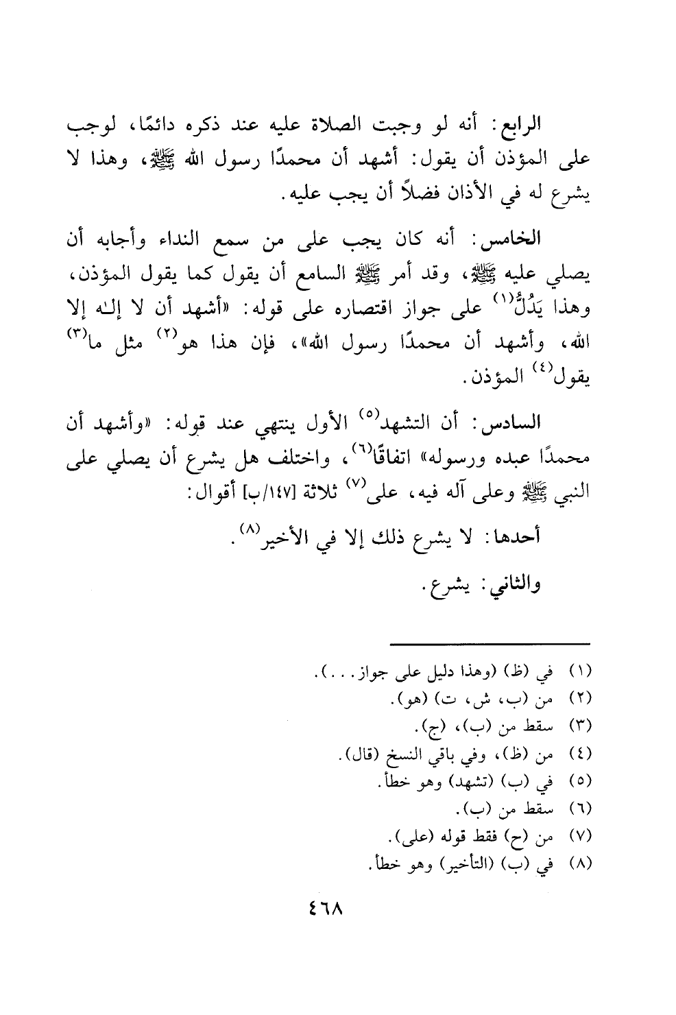 السادس: أن التشهد () الاول ينتهى عند قوله: "وأشهد أ ن