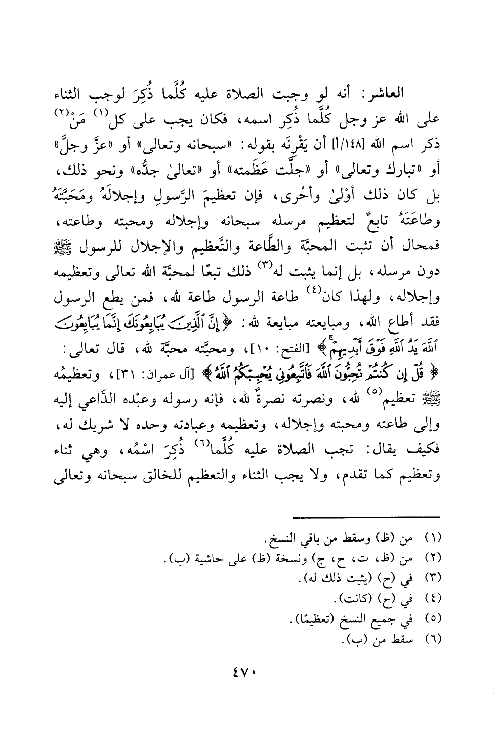 العاشر: أنه لو وجبت الصلاة عليه كلما ذكر لوجب الثناء
