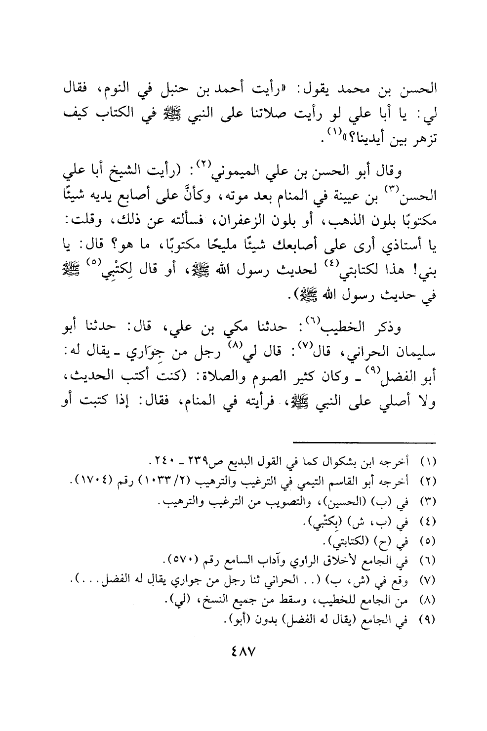 الحسن بن محمد يقول: "رأيت أحمد بن حنبل في النوم، فقال