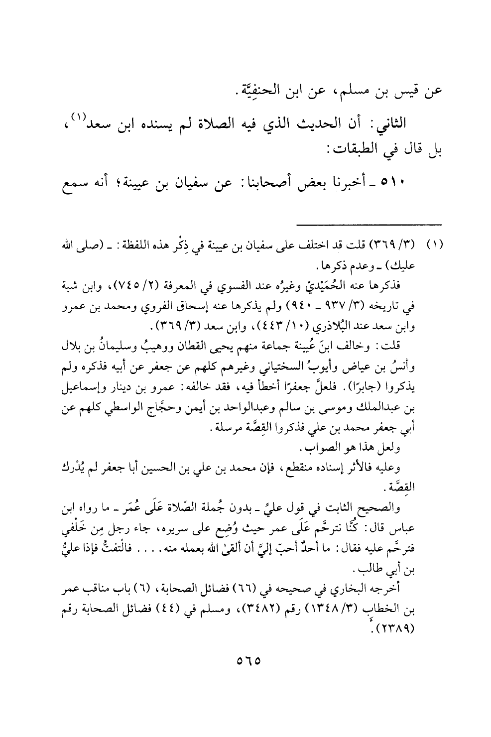 الثاني: ان الحديث الذي فيه الصلاة لم يسنده ابن سعد (1)