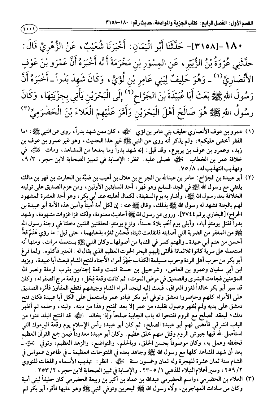 180 - [3158] حَدَّثَنَا أَبُو الْيَمَانِ: أَخْبَرَنَا شُعَيْبٌ، عَنْ الزُّهْرِيِّ قَالَ: حدَثَنِي عُرْوَةُ بْنُ الزُّبَيْرِ، عَنِ المِسْوَرِ بْنِ مَخْرَمَةَ أنَّه أَخْبَرَهُ أَنَّ عَمْرَو بْنَ عَوْفٍ الأنصارِيَّ (¬1) - وَهُوَ حَلِيف لِبَنِي عَامِرِ بْنِ لُؤَيٍّ، وَكَانَ شَهدَ بَدْرا- أَخْبَرَهُ «أَنَّ رَسُولَ اللهِ صلى الله عليه وسلم بَعَثَ أَبَا عُبَيْدَةَ بْنَ الجَرَّاحِ (¬2) إِلَى الْبَحْرَيْنِ يَأْتِي بِجِزْيَتِهَا، وَكَانَ رسُولُ اللهِ صلى الله عليه وسلم هُوَ صَالَحَ أَهْلَ الْبَحْرَيْنِ وَأَمَّرَ عَلَيْهِمْ الْعَلاءَ بْنَ الْحَضْرَمِيِّ (¬3)