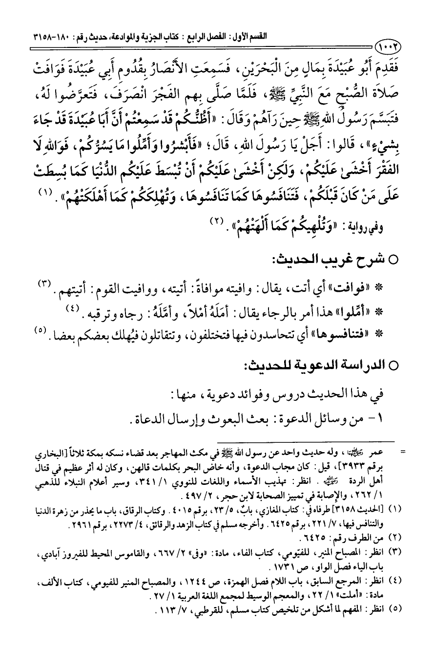 (¬1) [الحديث 3158] طرفاه في كتاب المغازي، باب، 5/ 23، برقم 4015. وكتاب الرقاق، باب ما يحذر من زهرة الدنيا والتنافس فيها، 7/ 221، برقم 6425. وأخرجه مسلم في كتاب الزهد والرقائق، 4/ 2273، برقم 2961.