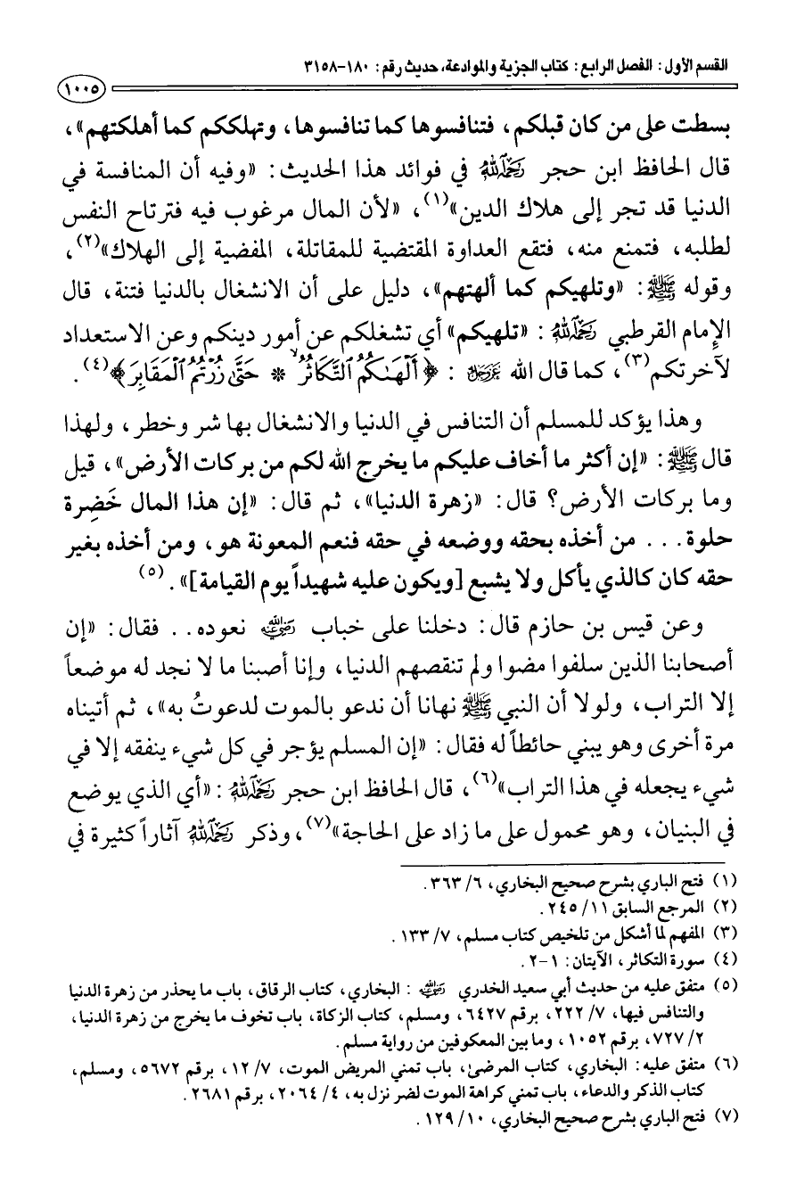 بسطت على من كان قبلكم، فتنافسوها كما تنافسوها، وتهلككم كما أهلكتهم»، قال الحافظ ابن حجر رحمه الله في فوائد هذا الحديث: "وفيه أن المنافسة في الدنيا قد تجر إلى هلاك الدين" (¬1) "لأن المال مرغوب فيه فترتاح النفس لطلبه، فتمنع منه، فتقع العداوة المقتضية للمقاتلة، المفضية إلى الهلاك " (¬2) وقوله صلى الله عليه وسلم: «وتلهيكم كما ألهتهم»، دليل على أن الانشغال بالدنيا فتنة، قال الإِمام القرطبي رحمه الله: "تلهيكم" أي تشغلكم عن أمور دينكم وعن الاستعداد لآخرتكم (¬3) كما قال الله عز وجل: {أَلْهَاكُمُ التَّكَاثُرُ - حَتَّى زُرْتُمُ الْمَقَابِرَ} [التكاثر: 1 - 2] (¬4) وهذا يؤكد للمسلم أن التنافس في الدنيا والانشغال بها شر وخطر، ولهذا قال صلى الله عليه وسلم: «إن أكثر ما أخاف عليكم ما يخرج الله لكم من بركات الأرض "، قيل وما بركات الأرض؛ قال: "زهرة الدنيا"، ثم قال: "إن هذا المال خَضِرة حلوة. . . من أخذه بحقه ووضعه في حقه فنعم المعونة هو، ومن أخذه بغير حقه كان كالذي يأكل ولا يشبع [ويكون عليه شهيدا يوم القيامة]». (¬5).