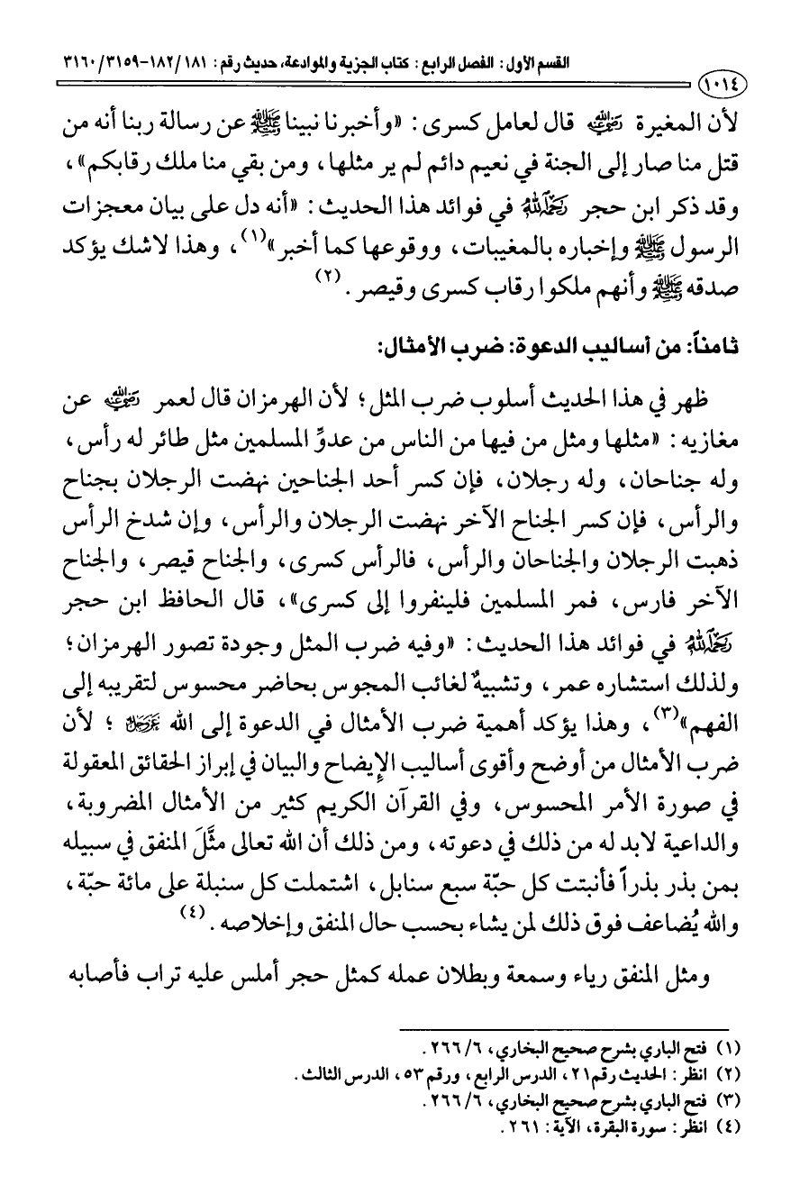 ثامنا: من أساليب الدعوة: ضرب الأمثال: ظهر في هذا الحديث أسلوب ضرب المثل؛ لأن الهرمزان قال لعمر رضي الله عنه عن مغازيه: "مثلها ومثل من فيها من الناس من عدوِّ المسلمين مثل طائر له رأس، وله جناحان، وله رجلان، فإن كسر أحد الجناحين نهضت الرجلان بجناح والرأس، فإن كسر الجناح الآخر نهضت الرجلان والرأس، وإن شدخ الرأس ذهبت الرجلان والجناحان والرأس، فالرأس كسرى، والجناح قيصر، والجناح الآخر فارس، فمر المسلمين فلينفروا إلى كسرى "، قال الحافظ ابن حجر رحمه الله في فوائد هذا الحديث: "وفيه ضرب المثل وجودة تصور الهرمزان؛ ولذلك استشاره عمر، وتشبيهٌ لغائب المجوس بحاضر محسوس لتقريبه إلى الفهم " (¬3) وهذا يؤكد أهمية ضرب الأمثال في الدعوة إلى الله عز وجل؛ لأن ضرب الأمثال من أوضح وأقوى أساليب الإِيضاح والبيان في إبراز الحقائق المعقولة في صورة الأمر المحسوس، وفي القرآن الكريم كثير من الأمثال المضروبة، والداعية لا بد له من ذلك في دعوته، ومن ذلك أن الله تعالى مثَّلَ المنفق في سبيله بمن بذر بذرا فأنبتت كل حبّة سبع سنابل، اشتملت كل سنبلة على مائة حبّة، والله يُضاعف فوق ذلك لمن يشاء بحسب حال المنفق وإخلاصه (¬4).
