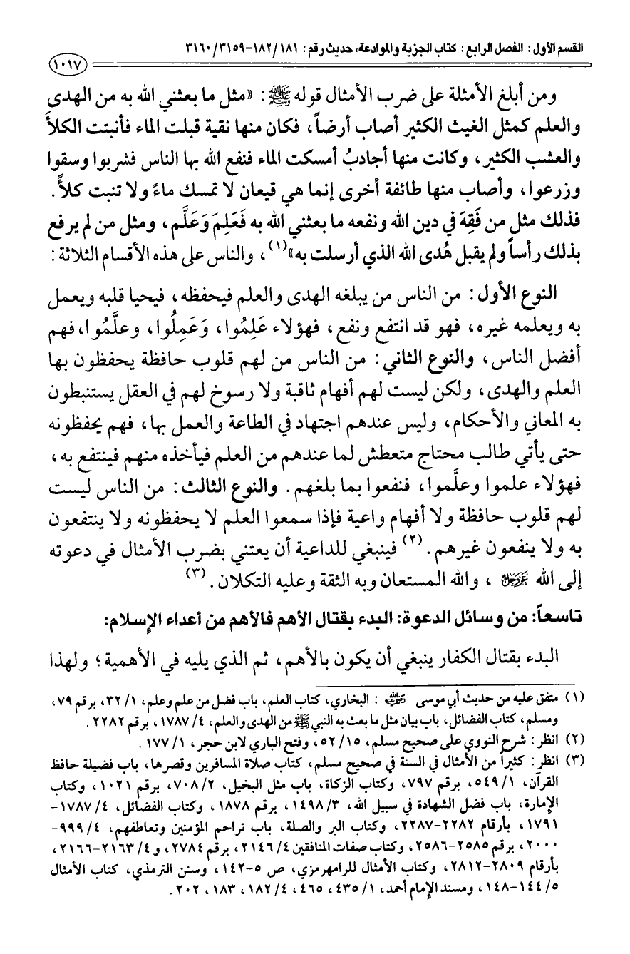 ومن أبلغ الأمثلة على ضرب الأمثال قوله صلى الله عليه وسلم: «مثل ما بعثني الله به من الهدى والعلم كمثل الغيث الكثير أصاب أرضا، فكان منها نقية قبلت الماء فأنبتت الكلأَ والعشب الكثير، وكانت منها أجادبُ أمسكت الماء فنفع الله بها الناس فشربوا وسقوا وزرعوا، وأصاب منها طائفة أخرى إنما هي قيعان لا تمسك ماءً ولا تنبت كلأً. فذلك مثل من فَقهَ في دين الله ونفعه ما بعثني الله به فَعَلِمَ وَعَلَّم، ومثل من لم يرفع بذلك رأسا ولم يقبل هُدى الله الذي أرسلت به» (¬1) والناس على هذه الأقسام الثلاثة:
