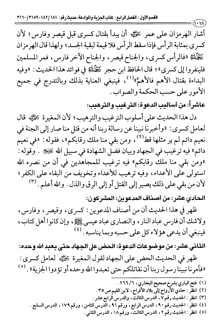 عاشرا: من أساليب الدعوة: الترغيب والترهيب: دل هذا الحديث على أسلوب الترغيب والترهيب؛ لأن المغيرة رضي الله عنه قال لعامل كسرى: «وأخبرنا نبينا عن رسالة ربنا أنه من قتل منا صار إلى الجنة في نعيم دائم لم ير مثلها قط (¬2) ومن بقي منا ملك رقابكم»، فقوله: «في نعيم دائم» فيه ترغيب في الجهاد وبيان فضل الشهادة في سبيل الله عز وجل. وقوله: «ومن بقي منا ملك رقابكم» فيه ترغيب للمجاهدين في أن من نصره الله استولى على الأعداء، وفيه ترهيب للأعداء وتخويف من البقاء على الكفر؛ لأن من بقي على ذلك يصير إلى القتل أو إلى الرق والذل. والله أعلم. (¬3).