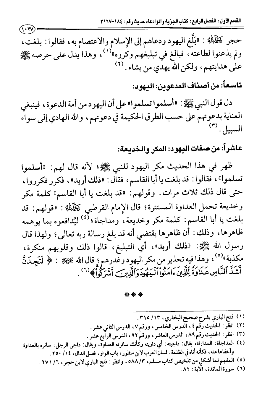 عاشرا: من صفات اليهود: المكر والخديعة: ظهر في هذا الحديث مكر اليهود للنبي صلى الله عليه وسلم لأنه قال لهم: "أسلموا تسلموا"، فقالوا: قد بلغت يا أبا القاسم، فقال: "ذلك أريد"، فكرر فكرروا، حتى قال ذلك ثلاث مرات. وقولهم: "قد بلغت يا أبا القاسم " كلمة مكر وخديعة تحمل العداوة المستترة؛ قال الإِمام القرطبي رحمه الله: "قولهم: قد بلغت يا أبا القاسم: كلمة مكر وخديعة، ومداجاة؛ (¬4) ليُدافعوه بما يوهمه ظاهرها، وذلك: أن ظاهرها يقتضي أنه قد بلغ رسالة ربه تعالى؛ ولهذا قال رسول الله صلى الله عليه وسلم: "ذلك أريد"، أي التبليغ، قالوا ذلك وقلوبهم منكرة، مكذبة" (¬5) وهذا فيه تحذير من مكر اليهود وغدرهم؛ قال الله عز وجل: {لَتَجِدَنَّ أَشَدَّ النَّاسِ عَدَاوَةً لِلَّذِينَ آمَنُوا الْيَهُودَ وَالَّذِينَ أَشْرَكُوا} [المائدة: 82] (¬6) * * * *
