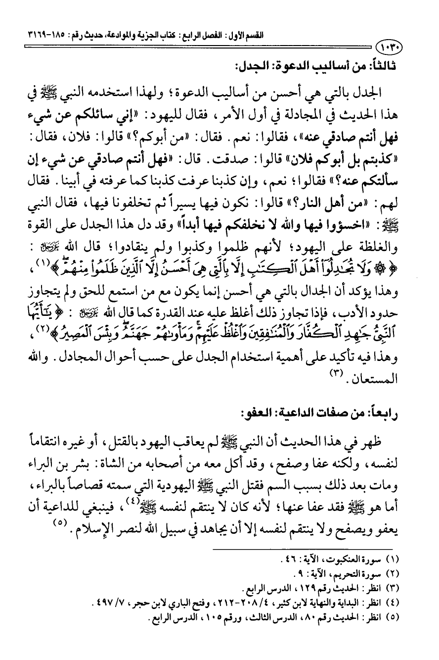 ثالثا: من أساليب الدعوة: الجدل: الجدل بالتي هي أحسن من أساليب الدعوة؛ ولهذا استخدمه النبي - صَلَّى اللَّهُ عَلَيْهِ وَسَلَّمَ - في هذا الحديث في المجادلة في أول الأمر، فقال لليهود: «إني سائلكم عن شيء فهل أنتم صادقي عنه"، فقالوا: نعم. فقال: "من أبوكم؟ " قالوا: فلان، فقال: "كذبتم بل أبوكم فلان" قالوا: صدقت. قال: "فهل أنتم صادقي عن شيء إن سألتكم عنه؛ " فقالوا؛ نعم، وإن كذبنا عرفت كذبنا كما عرفته في أبينا. فقال لهم: "من أهل النار؟ " قالوا: نكون فيها يسيرًا ثم تخلفونا فيها، فقال النبي - صَلَّى اللَّهُ عَلَيْهِ وَسَلَّمَ -: "اخسئوا فيها والله لا نخلفكم فيها أبدا» وقد دل هذا الجدل على القوة والغلظة على اليهود؛ لأنهم ظلموا وكذبوا ولم ينقادوا؛ قال الله عز وجل: {وَلَا تُجَادِلُوا أَهْلَ الْكِتَابِ إِلَّا بِالَّتِي هِيَ أَحْسَنُ إِلَّا الَّذِينَ ظَلَمُوا مِنْهُمْ} [العنكبوت: 46] (¬1) وهذا يؤكد أن الجدال بالتي هي أحسن إنما يكون مع من استمع للحق ولم يتجاوز حدود الأدب، فإذا تجاوز ذلك أغلظ عليه عند القدرة كما قال الله عز وجل: {يَا أَيُّهَا النَّبِيُّ جَاهِدِ الْكُفَّارَ وَالْمُنَافِقِينَ وَاغْلُظْ عَلَيْهِمْ وَمَأْوَاهُمْ جَهَنَّمُ وَبِئْسَ الْمَصِيرُ} [التحريم: 9] (¬2) وهذا فيه تأكيد على أهمية استخدام الجدل على حسب أحوال المجادل، والله المستعان (¬3).