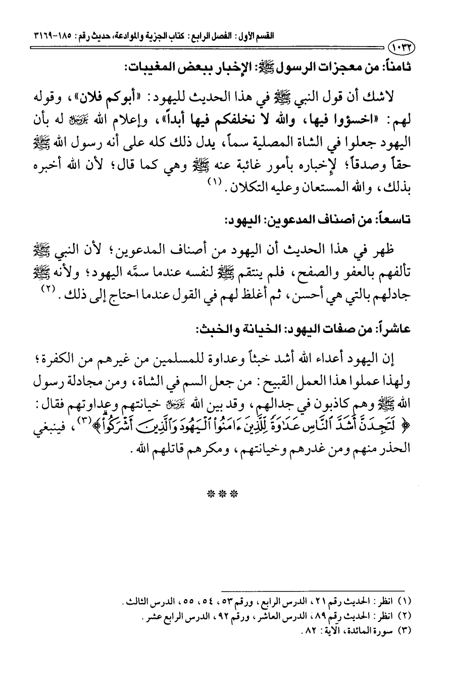 عاشرا: من صفات اليهود: الخيانة والخبث: إن اليهود أعداء الله أشد خبثا وعداوة للمسلمين من غيرهم من الكفرة؛ ولهذا عملوا هذا العمل القبيح: من جعل السم في الشاة، ومن مجادلة رسول الله - صَلَّى اللَّهُ عَلَيْهِ وَسَلَّمَ - وهم كاذبون في جدالهم، وقد بين الله عز وجل خيانتهم وعداوتهم فقال: {لَتَجِدَنَّ أَشَدَّ النَّاسِ عَدَاوَةً لِلَّذِينَ آمَنُوا الْيَهُودَ وَالَّذِينَ أَشْرَكُوا} [المائدة: 82] (¬3) فينبغي الحذر منهم ومن غدرهم وخيانتهم، ومكرهم قاتلهم الله.