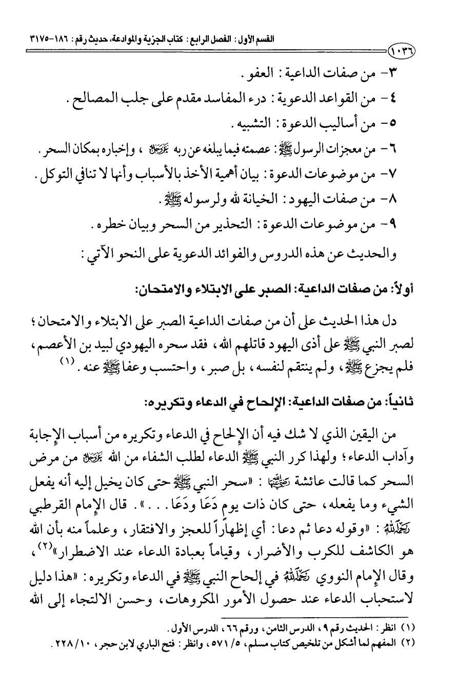 ثانيا: من صفات الداعية: الإلحاح في الدعاء وتكريره: من اليقين الذي لا شك فيه أن الإِلحاح في الدعاء وتكريره من أسباب الإِجابة وآداب الدعاء؛ ولهذا كرر النبي - صَلَّى اللَّهُ عَلَيْهِ وَسَلَّمَ - الدعاء لطلب الشفاء من الله عز وجل من مرض السحر كما قالت عائشة رضي الله عنها: «سحر النبي - صَلَّى اللَّهُ عَلَيْهِ وَسَلَّمَ - حتى كان يخيل إليه أنه يقول الشيء وما يفعله، حتى كان ذات يومٍ دَعَا ودَعَا». . . " قال الإِمام القرطبي رحمه الله: "وقوله دعا ثم دعا: أي إظهارًا للعجز والافتقار، وعلما منه بأن الله هو الكاشف للكرب والأضرار، وقياما بعبادة الدعاء عند الاضطرار" (¬2) وقال الإِمام النووي رحمه الله في إلحاح النبي - صَلَّى اللَّهُ عَلَيْهِ وَسَلَّمَ - في الدعاء وتكريره: "هذا دليل لاستحباب الدعاء عند حصول الأمور المكروهات، وحسن الالتجاء إلى الله