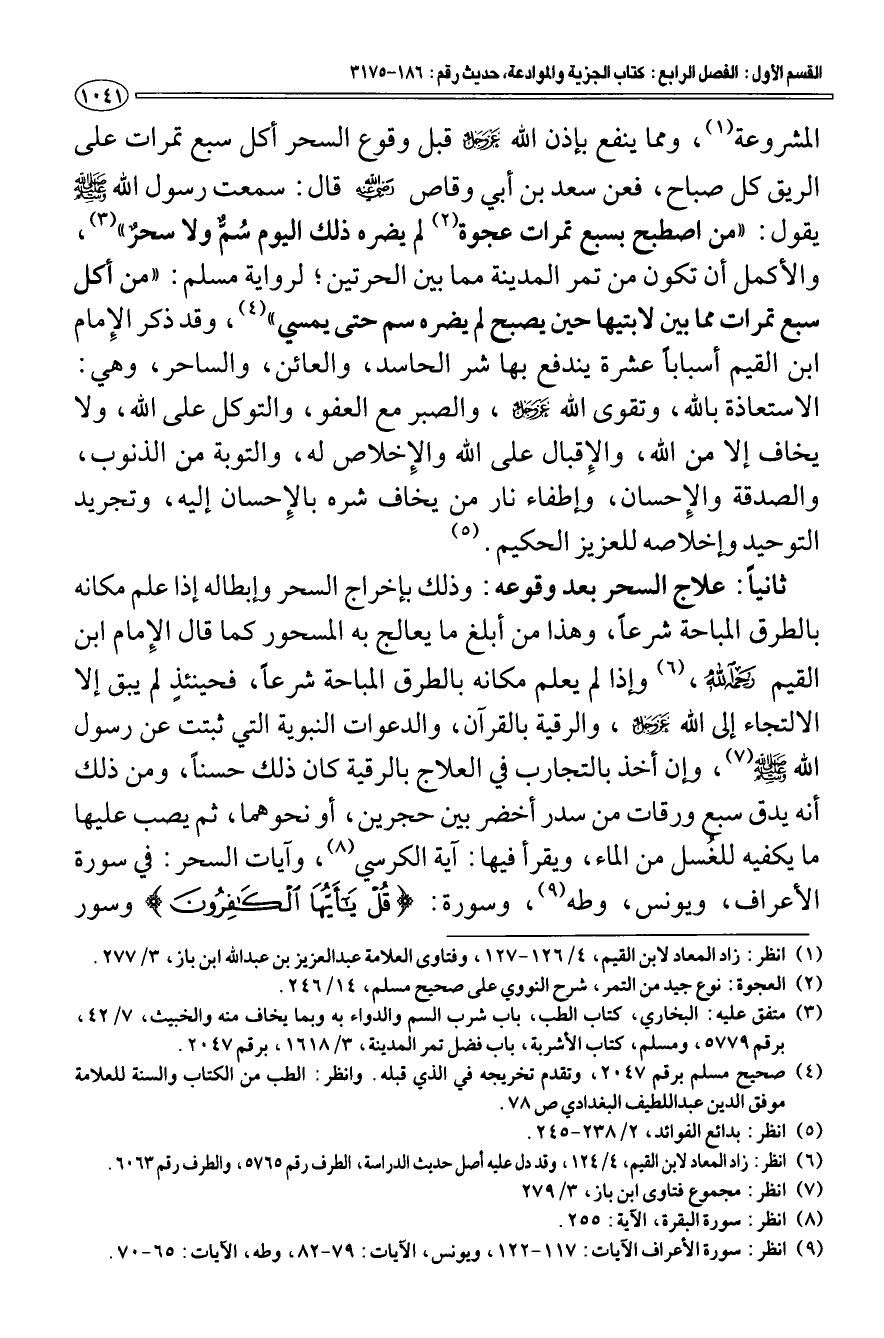 المشروعة (¬1) ومما ينفع بإذن الله عَزَّ وجلَّ قبل وقوع السحر أكل سبع تمرات على الريق كل صباح، فعن سعد بن أبي وقاص رَضِيَ اللَّهُ عَنْهُ قال: سمعت رسول الله - صَلَّى اللَّهُ عَلَيْهِ وَسَلَّمَ - يقول: «من اصطبح بسبع تمرات عجوة (¬2) لم يضره ذلك اليوم سم ولا سحر» (¬3) والأكمل أن تكون من تمر المدينة مما بين الحرتين؛ لرواية مسلم: «من أكل سبع تمرات مما بين لابتيها حين يصبح لم يضره سم حتى يمسي» (¬4) وقد ذكر الإمام ابن القيم أسبابا عشرة يندفع بها شر الحاسد، والعائن، والساحر، وهي: الاستعاذة بالله، وتقوى الله عزَّ وجلَّ، والصبر مع العفو، والتوكل على الله، ولا يخاف إلا من الله، والإقبال على الله والإخلاص له، والتوبة من الذنوب، والصدقة والإحسان، وإطفاء نار من يخاف شره بالإحسان إليه، وتجريد التوحيد وإخلاصه للعزيز الحكيم (¬5).