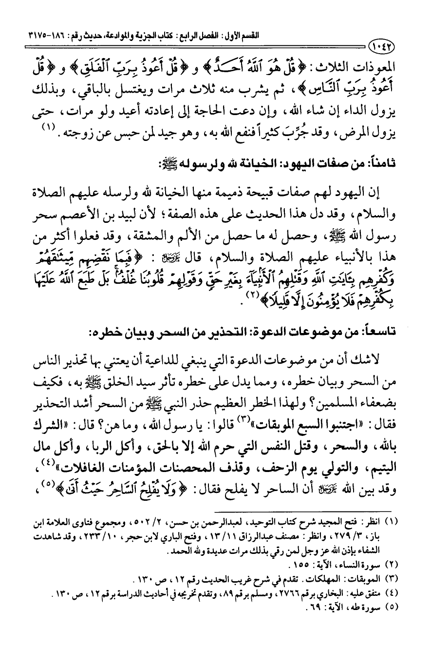 (¬1) انظر: فتح المجيد شرح كتاب التوحيد، لعبد الرحمن بن حسن، 2/ 502، ومجموع فتاوى العلامة ابن باز، 3/ 279، وانظر: مصنف عبد الرزاق 11/ 13، وفتح الباري لابن حجر، 10/ 233، وقد شاهدت الشفاء بإذن الله عز وجل لمن رقي بذلك مرات عديدة ولله الحمد.