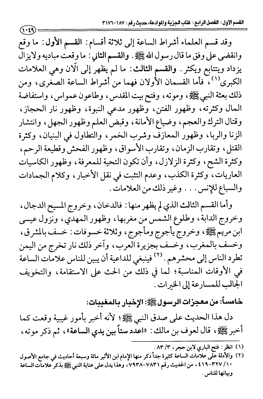 (¬2) والأدلة على علامات الساعة كثيرة جدا ذكر منها الإمام ابن الأثير مائة وسبعة أحاديث في جامع الأصول 10/ 327 - 419، من الحديث رقم 7831 - 7938، وهذا يدل على عناية النبي - صَلَّى اللَّهُ عَلَيْهِ وَسَلَّمَ - بذكر علامات الساعة وبيانها للناس.