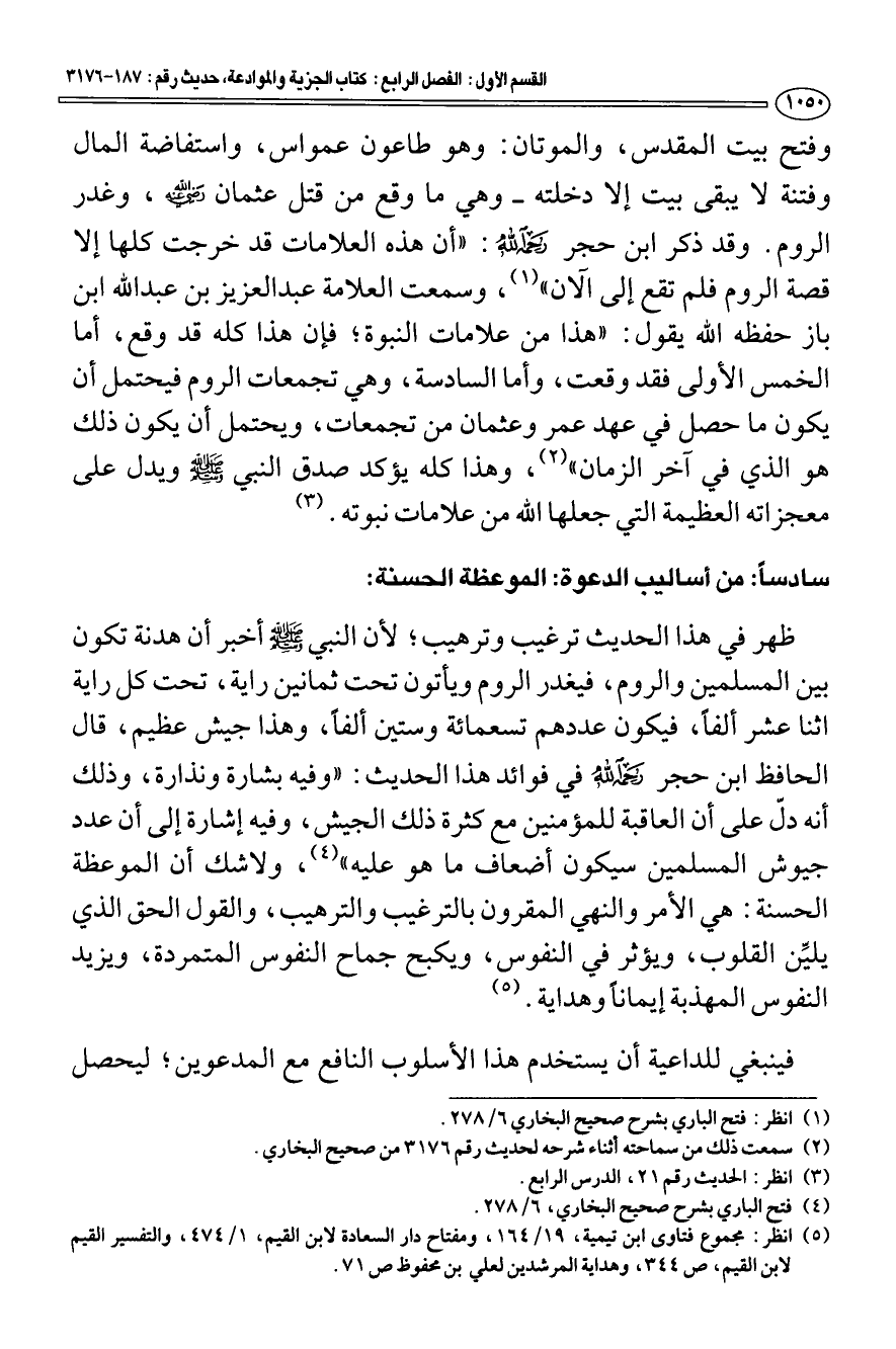 سادسا: من أساليب الدعوة: الموعظة الحسنة: ظهر في هذا الحديث ترغيب وترهيب، لأن النبي - صَلَّى اللَّهُ عَلَيْهِ وَسَلَّمَ - أخبر أن هدنة تكون بين المسلمين والروم، فيغدر الروم ويأتون تحت ثمانين راية، تحت كل راية اثنا عشر ألفا، فيكون عددهم تسعمائة وستين ألفا، وهذا جيش عظيم، قال الحافظ ابن حجر رحمه الله في فوائد هذا الحديث: "وفيه بشارة ونذارة، وذلك أنه دل على أن العاقبة للمؤمنين مع كثرة ذلك الجيش، وفيه إشارة إلى أن عدد جيوش المسلمين سيكون أضعاف ما هو عليه" (¬4) ولا شك أن الموعظة الحسنة: هي الأمر والنهي المقرون بالترغيب والترهيب، والقول الحق الذي يلين القلوب، ويؤثر في النفوس، ويكبح جماح النفوس المتمردة، ويزيد النفوس المهذبة إيمانا وهداية (¬5).