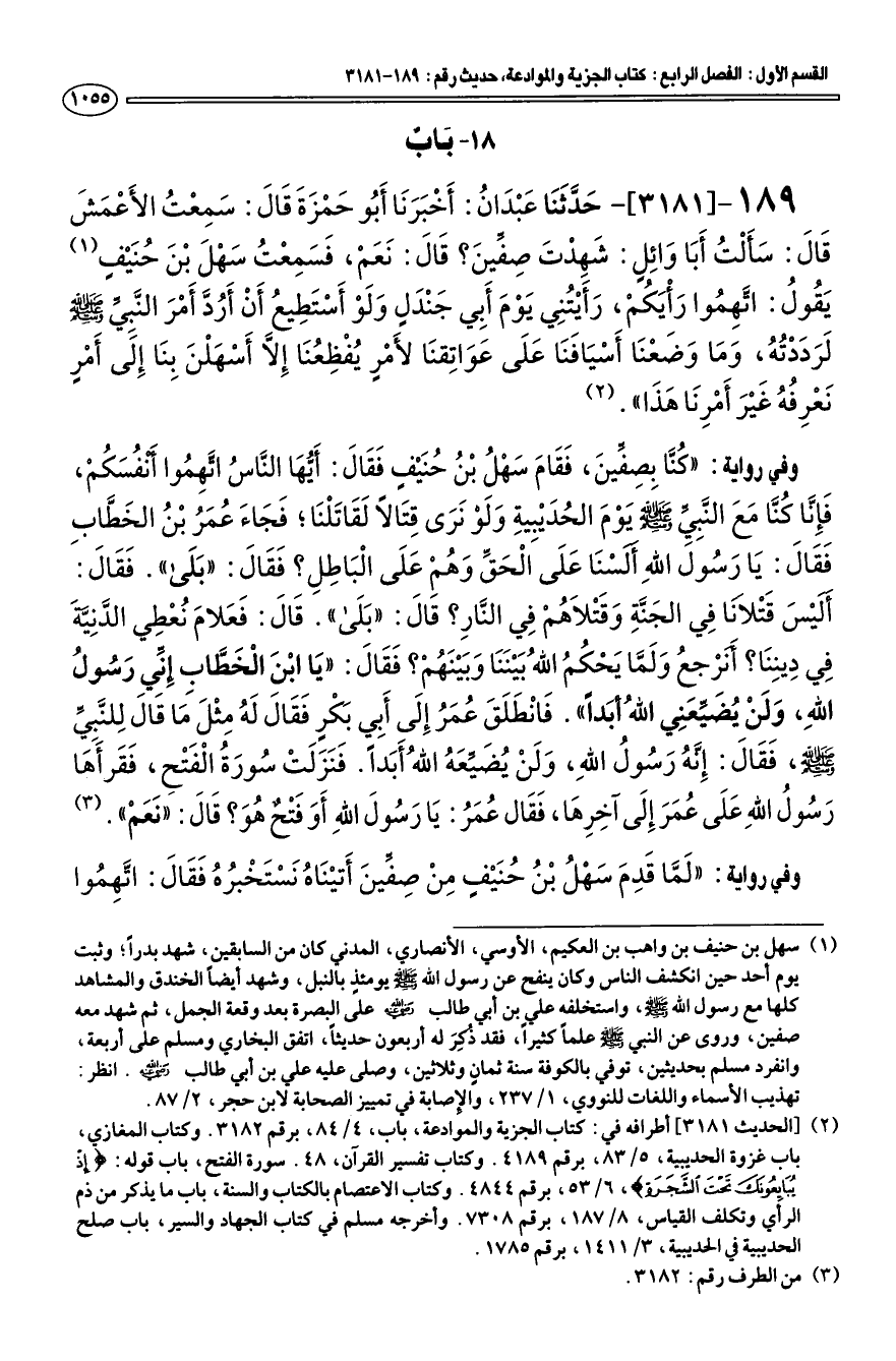 (¬2) [الحديث 3181] أطرافه في: كتاب الجزية والموادعة، باب، 4/ 84، برقم 3182. وكتاب المغازي باب غزوة الحديبية، 5/ 83، برقم 4189. وكتاب تفسير القرآن، 48. سورة الفتح، باب قوله: إِذْ يُبَايِعُونَكَ تَحْتَ الشَّجَرَةِ، 6/ 53، برقم 4844. وكتاب الاعتصام بالكتاب والسنة، باب ما يذكر من ذم الرأي وتكلف القياس، 8/ 187، برقم 7308. وأخرجه مسلم في كتاب الجهاد والسير، باب صلح الحديبية في الحديبية، 3/ 1411، برقم 1785.