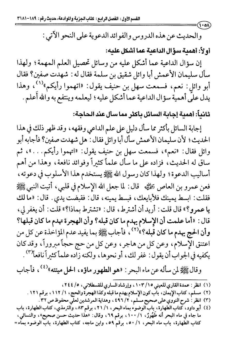 ثانيا: أهمية إجابة السائل بأكثر مما سأل عند الحاجة: إجابة السائل بأكثر مما سأل دليل على علم الداعي وفقهه، وقد ظهر ذلك في هذا الحديث؛ لأن سليمان الأعمش سأل أبا وائل فقال: هل شهدت صفين؟ فأجابه أبو وائل فقال: "نعم"، فسمعت سهل بن حنيف يقول: "اتهموا رأيكم. . . "، ثم ساق له الحديث، فزاده على ما سأل علما كثيرا وفوائد نافعة، وهذا من أهم أساليب الدعوة " ولهذا كان رسول الله - صَلَّى اللَّهُ عَلَيْهِ وَسَلَّمَ - يستخدم هذا الأسلوب في دعوته، فعن عمرو بن العاص رضي الله عنه قال: «لما جعل الله الإسلام في قلبي، أتيت النبي - صَلَّى اللَّهُ عَلَيْهِ وَسَلَّمَ - فقلت: ابسط يمينك فلأبايعك، فبسط يمينه، قال: فقبضت يدي. قال: "ما لك يا عمرو؟ " قال قلت: أريد أن أشترط، قال: "تشترط بماذا؟ " قلت: أن يغفر لي، قال: "أما علمت أن الإسلام يهدم ما كان قبله؟ وأن الهجرة تهدم ما كان قبلها؟ وأن الحج يهدم ما كان قبله؟» (¬2) فأجاب - صَلَّى اللَّهُ عَلَيْهِ وَسَلَّمَ - بما يفيد عدم المؤاخذة عن كل من اعتنق الإسلام، وعن كل من هاجر، وعن كل من حج حجا مبرورا، وقد كان يكفيه في الجواب أن يقول: غفر لك، أو نحوها، ولكنه زاده علما كثيرا نافعا (¬3) وقال - صَلَّى اللَّهُ عَلَيْهِ وَسَلَّمَ - لمن سأله عن ماء البحر: «هو الطهور ماؤه، الحل ميتته» (¬4) فأجاب