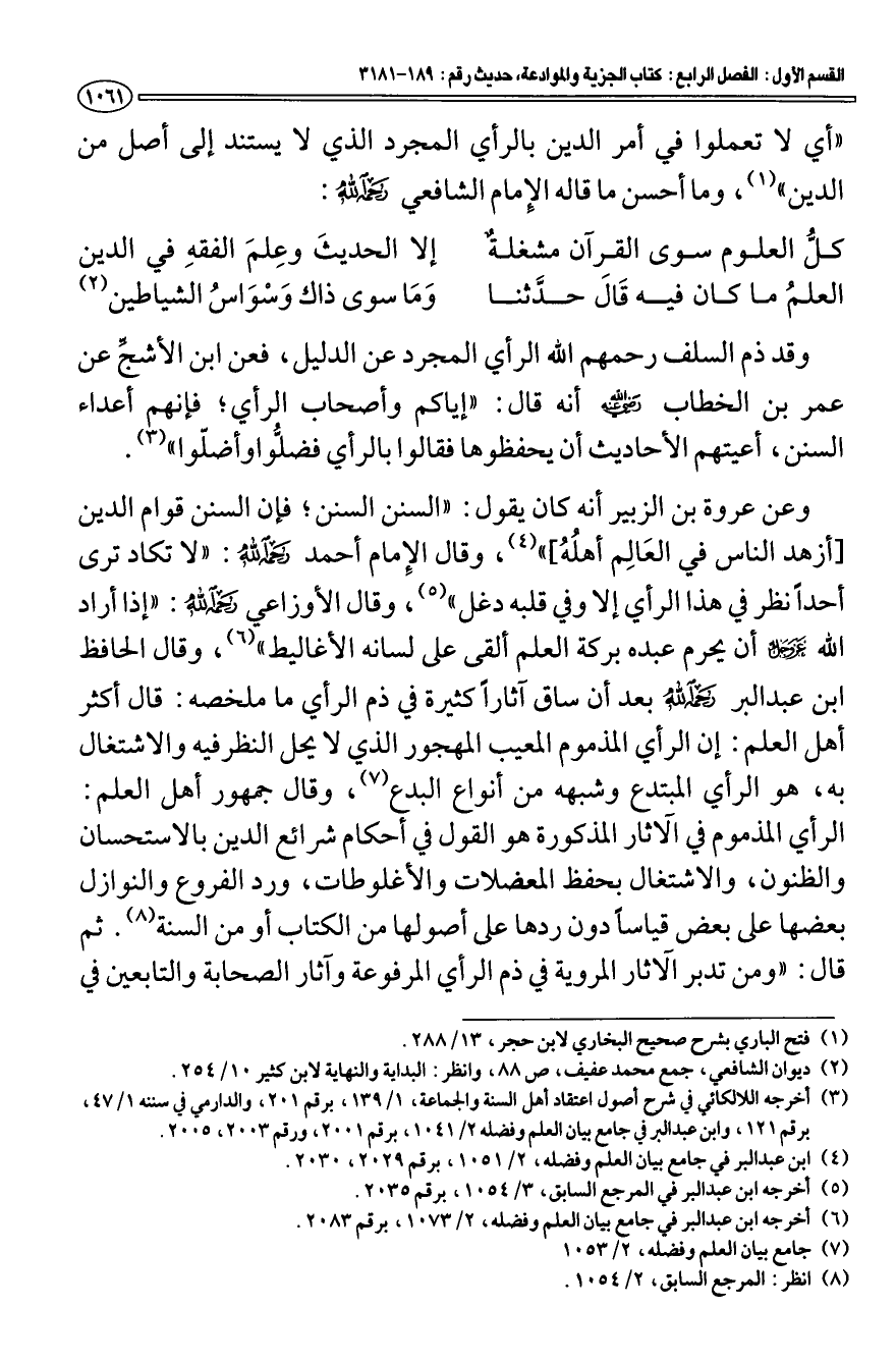 وعن عروة بن الزبير أنه كان يقول: " السُّنَنَ السُّنَنَ؛ فَإِنَّ السُنَّنَ قِوَامُ الدِّينِ [أَزْهَدُ النَّاسِ فِي الْعَالِمِ أَهْلُهُ] " (¬4) وقال الإمام أحمد رحمه الله: " لا تكاد ترى أحدا نظر في هذا الرأي إلا وفي قلبه دغل " (¬5) وقال الأوزاعي رحمه الله: " إذا أراد الله عز وجل أن يحرم عبده بركة العلم ألقى على لسانه الأغاليط " (¬6) وقال الحافظ ابن عبد البر رحمه الله بعد أن ساق آثارا كثيرة في ذم الرأي ما ملخصه: قال أكثر أهل العلم: إن الرأي المذموم المعيب المهجور الذي لا يحل النظر فيه والاشتغال به، هو الرأي المبتدع وشبهه من أنواع البدع (¬7) وقال جمهور أهل العلم: الرأي المذموم في الآثار المذكورة هو القول في أحكام شرائع الدين بالاستحسان والظنون، والاشتغال بحفظ المعضلات والأغلوطات، ورد الفروع والنوازل بعضها على بعض قياسا دون ردها على أصولها من الكتاب أو من السنة (¬8).