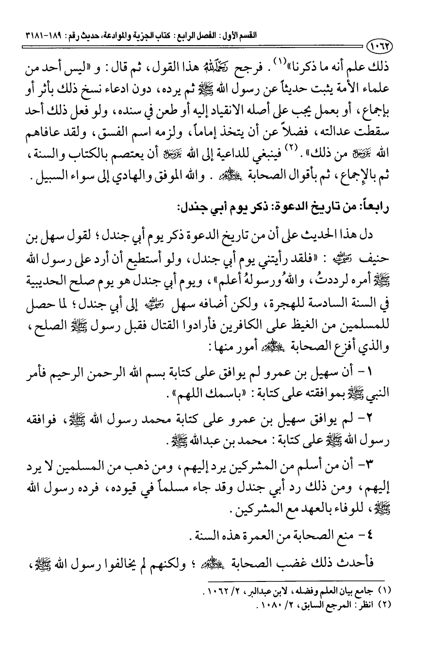 3 - أن من أسلم من المشركين يرد إليهم، ومن ذهب من المسلمين لا يرد إليهم، ومن ذلك رد أبي جندل وقد جاء مسلما في قيوده، فرده رسول الله - صَلَّى اللَّهُ عَلَيْهِ وَسَلَّمَ -، للوفاء بالعهد مع المشركين.