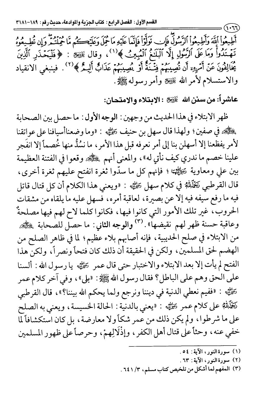 عاشرا: من سنن الله عز وجل: الابتلاء والامتحان: ظهر الابتلاء في هذا الحديث من وجهين: الوجه الأول: ما حصل بين الصحابة رضي الله عنهم في صفين؛ ولهذا قال سهل بن حنيف رضي الله عنه: " وما وضعنا أسيافنا على عواتقنا لأمر يفظعنا إلا أسهلن بنا إلى أمر نعرفه قبل هذا الأمر، ما نسد منها خُصما إلا انفجر علينا خصم ما ندري كيف نأتي له "، والمعنى أنهم رضي الله عنهم وقعوا في الفتنة العظيمة بين علي ومعاوية رضي الله عنهما؛ فإنهم كل ما سدوا ثغرة انفتح عليهم ثغرة أخرى، قال القرطبي رحمه الله في كلام سهل رضي الله عنه: " ويعني هذا الكلام أن كل قتال قاتل فيه ما رفع سيفه فيه إلا عن بصيرة، لعاقبة أمره، فسهل عليه ما يلقاه من مشقات الحروب، غير تلك الأمور التي كانوا فيها، فكانوا كلما لاح لهم فيها مصلحة وعاقبة حسنة ظهر لهم نقيضها " (¬2).