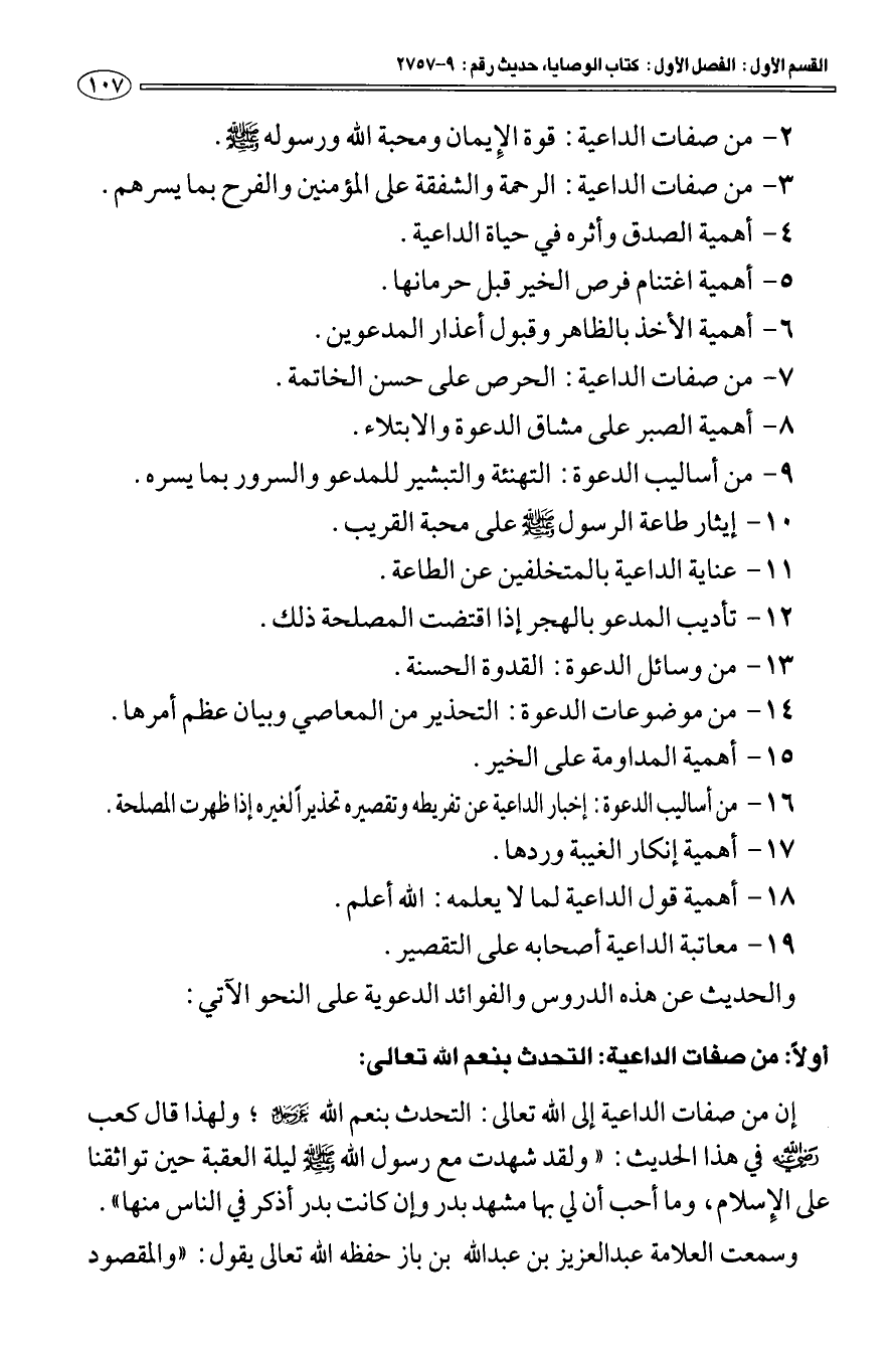 أولا: من صفات الداعية: التحدث بنعم الله تعالى: إن من صفات الداعية إلى الله تعالى: التحدث بنعم الله عز وجل ولهذا قال كعب رضي الله عنه في هذا الحديث: " ولقد شهدت مع رسول الله صلى الله عليه وسلم ليلة العقبة حين تواثقنا على الإسلام، وما أحب أن لي بها مشهد بدر وإن كانت بدر أذكر في الناس منها ".