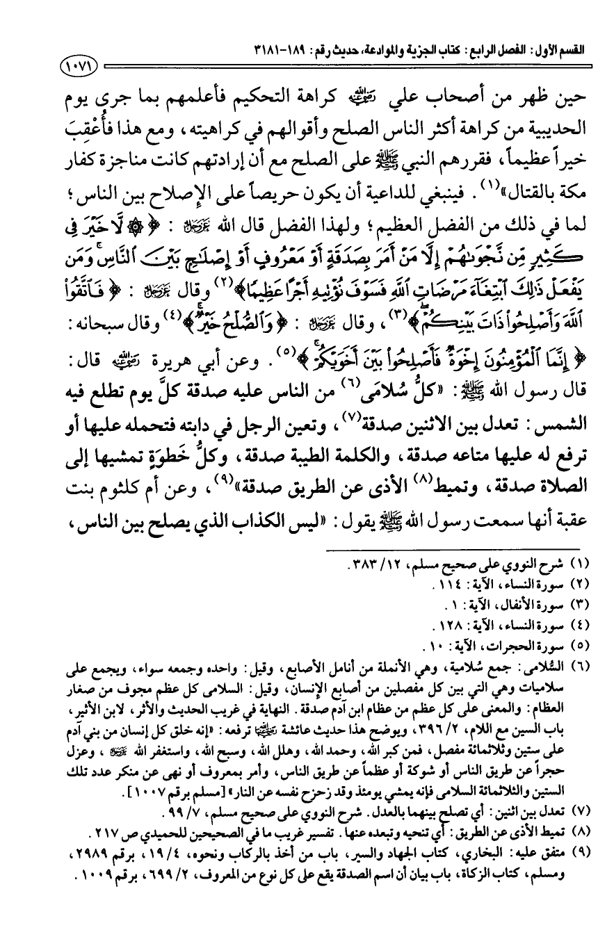 وقال سبحانه: {إِنَّمَا الْمُؤْمِنُونَ إِخْوَةٌ فَأَصْلِحُوا بَيْنَ أَخَوَيْكُمْ} [الحجرات: 10] (¬5) وعن أبي هريرة رضي الله عنه قال: قال رسول الله - صَلَّى اللَّهُ عَلَيْهِ وَسَلَّمَ -: «كل سلامى (¬6) من الناس عليه صدقة كل يوم تطلع فيه الشمس: تعدل بين الاثنين صدقة (¬7) وتعين الرجل في دابته فتحمله عليها أو ترفع له عليها متاعه صدقة، والكلمة الطيبة صدقة، وكل خطوة تمشيها إلى الصلاة صدقة، وتميط (¬8) الأذى عن الطريق صدقة» (¬9) وعن أم كلثوم بنت عقبة أنها سمعت رسول الله - صَلَّى اللَّهُ عَلَيْهِ وَسَلَّمَ - يقول: «ليس الكذاب الذي يصلح بين الناس،