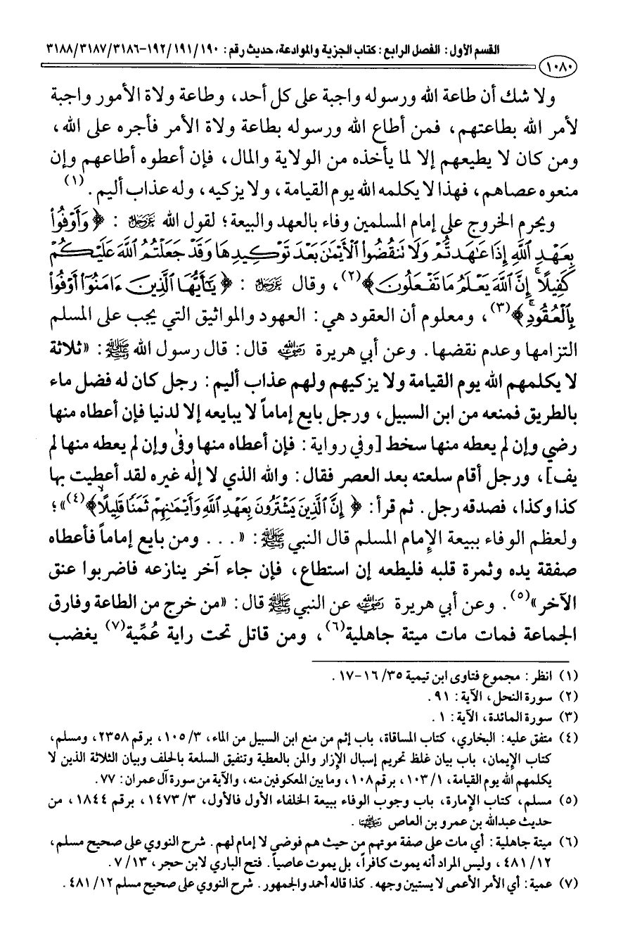 ولا شك أن طاعة الله ورسوله واجبة على كل أحد، وطاعة ولاة الأمور واجبة لأمر الله بطاعتهم، فمن أطاع الله ورسوله بطاعة ولاة الأمر فأجره على الله، ومن كان لا يطيعهم إلا لما يأخذه من الولاية والمال، فإن أعطوه أطاعهم وإن منعوه عصاهم، فهذا لا يكلمه الله يوم القيامة، ولا يزكيه، وله عذاب أليم (¬1) ويحرم الخروج على إمام المسلمين وفاء بالعهد والبيعة؛ لقول الله عز وجل: {وَأَوْفُوا بِعَهْدِ اللَّهِ إِذَا عَاهَدْتُمْ وَلَا تَنْقُضُوا الْأَيْمَانَ بَعْدَ تَوْكِيدِهَا وَقَدْ جَعَلْتُمُ اللَّهَ عَلَيْكُمْ كَفِيلًا إِنَّ اللَّهَ يَعْلَمُ مَا تَفْعَلُونَ} [النحل: 91] (¬2) وقال عز وجل: {يَا أَيُّهَا الَّذِينَ آمَنُوا أَوْفُوا بِالْعُقُودِ} [المائدة: 1] (¬3) ومعلوم أن العقود هي: العهود والمواثيق التي يجب على المسلم التزامها وعدم نقضها. وعن أبي هريرة رضي الله عنه قال: قال رسول الله - صَلَّى اللَّهُ عَلَيْهِ وَسَلَّمَ -: «ثَلَاثَةٌ لَا يُكَلِّمُهُمُ اللَّهُ يَوْمَ الْقِيَامَةِ وَلَا يُزَكِّيهِمْ وَلَهُمْ عَذَابٌ أَلِيمٌ: رَجُلٌ كَانَ لَهُ فَضْلُ مَاءٍ بِالطَّرِيقِ فَمَنَعَهُ مِنِ ابْنِ السَّبِيلِ، وَرَجُلٌ بَايَعَ إِمَامًا لَا يُبَايِعُهُ إِلَّا لِدُنْيَا فَإِنْ أَعْطَاهُ مِنْهَا رَضِيَ وَإِنْ لَمْ يُعْطِهِ مِنْهَا سَخِطَ [وَفِي رِوَايَةٍ: فَإِنْ أَعْطَاهُ مِنْهَا وَفَى وَإِنْ لَمْ يُعْطِهِ مِنْهَا لَمْ يَفِ]، وَرَجُلٌ أَقَامَ سِلْعَتَهُ بَعْدَ الْعَصْرِ فَقَالَ: وَاللَّهِ الَّذِي لَا إِلَهَ غَيْرُهُ لَقَدْ أُعْطِيتُ بِهَا كَذَا وَكَذَا، فَصَدَّقَهُ رَجُلٌ. ثُمَّ قَرَأَ: {إِنَّ الَّذِينَ يَشْتَرُونَ بِعَهْدِ اللَّهِ وَأَيْمَانِهِمْ ثَمَنًا قَلِيلًا} [آل عمران: 77]» (¬4)؛ ولعظم الوفاء ببيعة الإمام المسلم قال النبي - صَلَّى اللَّهُ عَلَيْهِ وَسَلَّمَ -: ". . . «وَمَنْ بَايَعَ إِمَامًا فَأَعْطَاهُ صَفْقَةَ يَدِهِ وَثَمَرَةَ قَلْبِهِ فَلْيُطِعْهُ إِنِ اسْتَطَاعَ، فَإِنْ جَاءَ آخَرُ يُنَازِعُهُ فَاضْرِبُوا عُنُقَ الْآخَرِ» (¬5) وعن أبي هريرة رضي الله عنه عن النبي - صَلَّى اللَّهُ عَلَيْهِ وَسَلَّمَ - قال: «مَنْ خَرَجَ مِنَ الطَّاعَةِ وَفَارَقَ الْجَمَاعَةَ فَمَاتَ مَاتَ مَيْتَةَ جَاهِلِيَّةٍ (¬6) وَمَنْ قَاتَلَ تَحْتَ رَايَةٍ عُمِّيَّةٍ (¬7) يَغْضَبُ