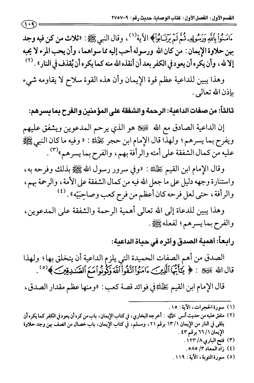 ثالثا: من صفات الداعية: الرحمة والشفقة على المؤمنين والفرح بما يسرهم: إن الداعية الصادق مع الله عز وجل هو الذي يرحم المدعوين ويشفق عليهم ويفرح بما يسرهم؛ ولهذا قال الإمام ابن حجر رحمه الله: " وفيه ما كان النبي صلى الله عليه وسلم عليه من كمال الشفقة على أمته والرأفة بهم، والفرح بما يسرهم " (¬3).