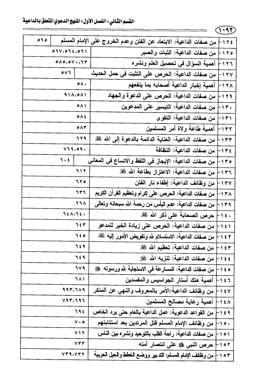 124 - من صفات الداعية: الابتعاد عن الفتن عدم الخروج على الإمام المسلم 565 125 من صفات الداعية: الثبات والصبر 561، 564، 567 126 أهمية السؤال في تحصيل العلم ونشره 63، 570، 585 127 من صفات الداعية: الحرص على التثبت في حمل الحديث 576 128 أهمية إخبار الداعية أصحابه بما ينفعهم 580 129 من صفات الداعية: الحرص على الدعوة والجهاد 581، 918 130 من صفات الداعية: التيسير على المدعوين 581 131 من صفات الداعية: التقوى 584 132 أهمية طاعة ولاة أمر المسلمين 583 133 من صفات الداعية: العناية الدائمة بالدعوة إلى الله عز وجل 629 134 من صفات الداعية: النظافة 590، 769 135 من صفات الداعية: الإيجاز في اللفظ والاتساع في المعاني 604 136 من صفات الداعية: الاعتزاز بطاعة الله عز وجل 612 137 من وظائف الداعية: إطفاء نار الفتن 625 138 من صفات الداعية: الحرص على إكرام وتعظيم القرآن الكريم 636 139 من صفات الداعية: عدم اليأس من رحمة الله سبحانه وتعالى 268 140 حرص الصحابة على ذكر الله عز وجل 640، 648 141 من صفات الداعية: الحرص على زيادة الخير للمدعو 643 142 من صفات الداعية: الاستسلام لله وتفيض الأمور إليه عز وجل 645 143 من صفات الداعية: تعظيم الله عز وجل 649 144 من صفات الداعية: تنزيه الله عز وجل 649 145 من صفات الداعية: المسارعة في الاستجابة لله ورسوله صلي الله عليه وسلم 679 146 أهمية هتك أستار الجواسيس والمفسدين 681 147 من وظائف الداعية: الأمر بالمعروف والنهي عن المنكر 689، 993 148 أهمية رعاية مصالح المسلمين 696، 793 149 من القواعد الدعوية: عمل الداعية بالعام حتى يرد الخاص 694 150 من وظائف الإمام المسلم قتل المرتدين بعد استتابتهم 705 151 من صفات الداعية: راحة القلب بالتوحيد ونشره بين الناس 712 152 حرص النبي صلي الله عليه وسلم على انتصار أمته 733 153 من وظائف الإمام المسلم: التدبير ووضع الخطط والحيل الحربية 732، 739