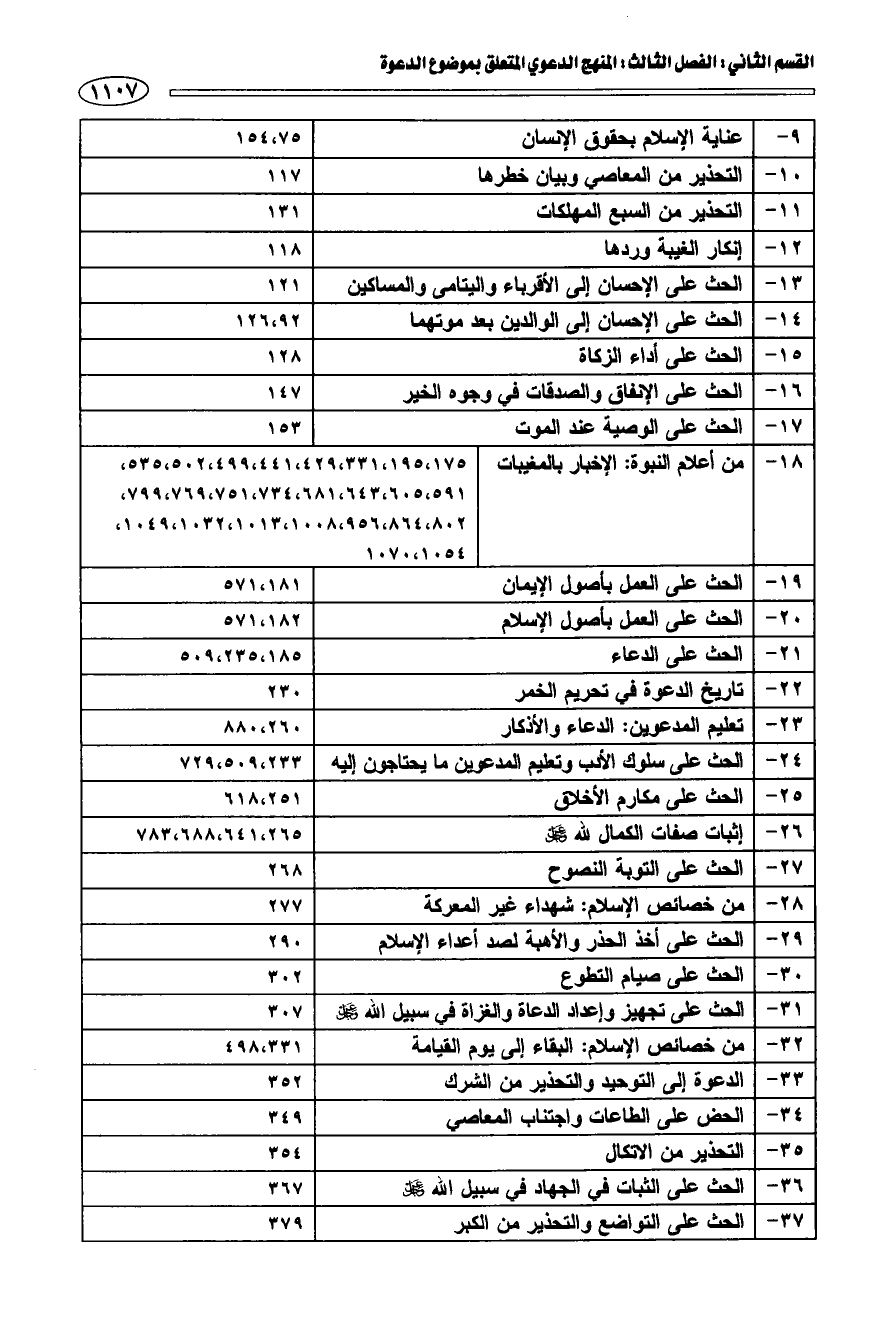 9 - عناية الإسلام بحقوق الإنسان 75، 154 10 التحذير من المعاصي وبيان خطرها 117 11 التحذير من السبع المهلكات 131 12 إنكار الغيبة وردها 118 13 الحث على الإحسان إلى الأقرباء واليتامى والمساكين 121 14 الحث على الإحسان إلى الوالدين بعد موتهما 92، 126 15 الحث على أداء الزكاة 128 16 الحث على الإنفاق والصدقات في وجوه الخير 147 17 الحث على الوصية عند الموت 153 18 من أعلام النبوة الإخبار بالمغيبات 175، 195، 331، 429، 441، 499، 502، 535، 591، 605، 643، 681، 734، 751، 769، 799، 802، 864، 956، 1008، 1013، 1032، 1049، 1054، 1070 19 الحث على العمل بأصول الإيمان 181، 571 20 الحث على العمل بأصول الإسلام 182، 571 21 الحث على الدعاء 185، 235، 509 22 تاريخ الدعوة في تحريم الخمر 230 23 تعليم المدعوين: الدعاء والأذكار 260 ,880 24 الحث على سلوك الأدب وتعلي المدعوين ما يحتاجون إليه 233، 509، 729 25 الحث على مكارم الأخلاق 251، 618 26 إثبات صفات الكمال لله عز وجل 265، 641، 688، 783 27 الحث على التوبة النصوح 268 28 من خصائص الإسلام: شهداء غير المعركة 277 29 الحث على اخذ الحذر والأهبة لصد أعداء الإسلام 290 30 الحث على صيام التطوع 302 31 الحث على تجهيز وإعداد الدعاة والغزاة في سبيل الله عز وجل 307 32 من خصائص الإسلام: البقاء إلى يوم القيامة 331، 498 33 الدعوة إلى التوحيد والتحذير من الشرك 352 34 الحض على الطاعات واجتناب المعاصي 349 35 التحذير من الاتكال 354 36 الحث على الثبات في الجهاد في سبيل الله عز وجل 367 37 الحث على التواضع والتحذير من الكبر 379