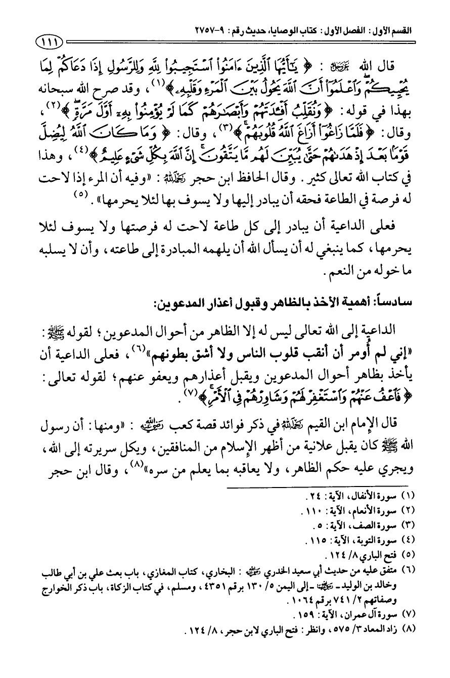 سادسا: أهمية الأخذ بالظاهر وقبول أعذار المدعوين: الداعية إلى الله تعالى ليس له إلا الظاهر من أحوال المدعوين؛ لقوله صلى الله عليه وسلم: «إني لم أومر أن أنقب قلوب الناس ولا أشق بطونهم» (¬6) فعلى الداعية أن يأخذ بظاهر أحوال المدعوين ويقبل أعذارهم ويعفو عنهم؛ لقوله تعالى: {فَاعْفُ عَنْهُمْ وَاسْتَغْفِرْ لَهُمْ وَشَاوِرْهُمْ فِي الْأَمْرِ} [آل عمران: 159] (¬7) قال الإمام ابن القيم رحمه الله في ذكر فوائد قصة كعب رضي الله عنه: " ومنها: أن رسول الله صلى الله عليه وسلم كان يقبل علانية من أظهر الإسلام من المنافقين، ويكل سريرته إلى الله، ويجري عليه حكم الظاهر، ولا يعاقبه بما يعلم من سره " (¬8) وقال ابن حجر
