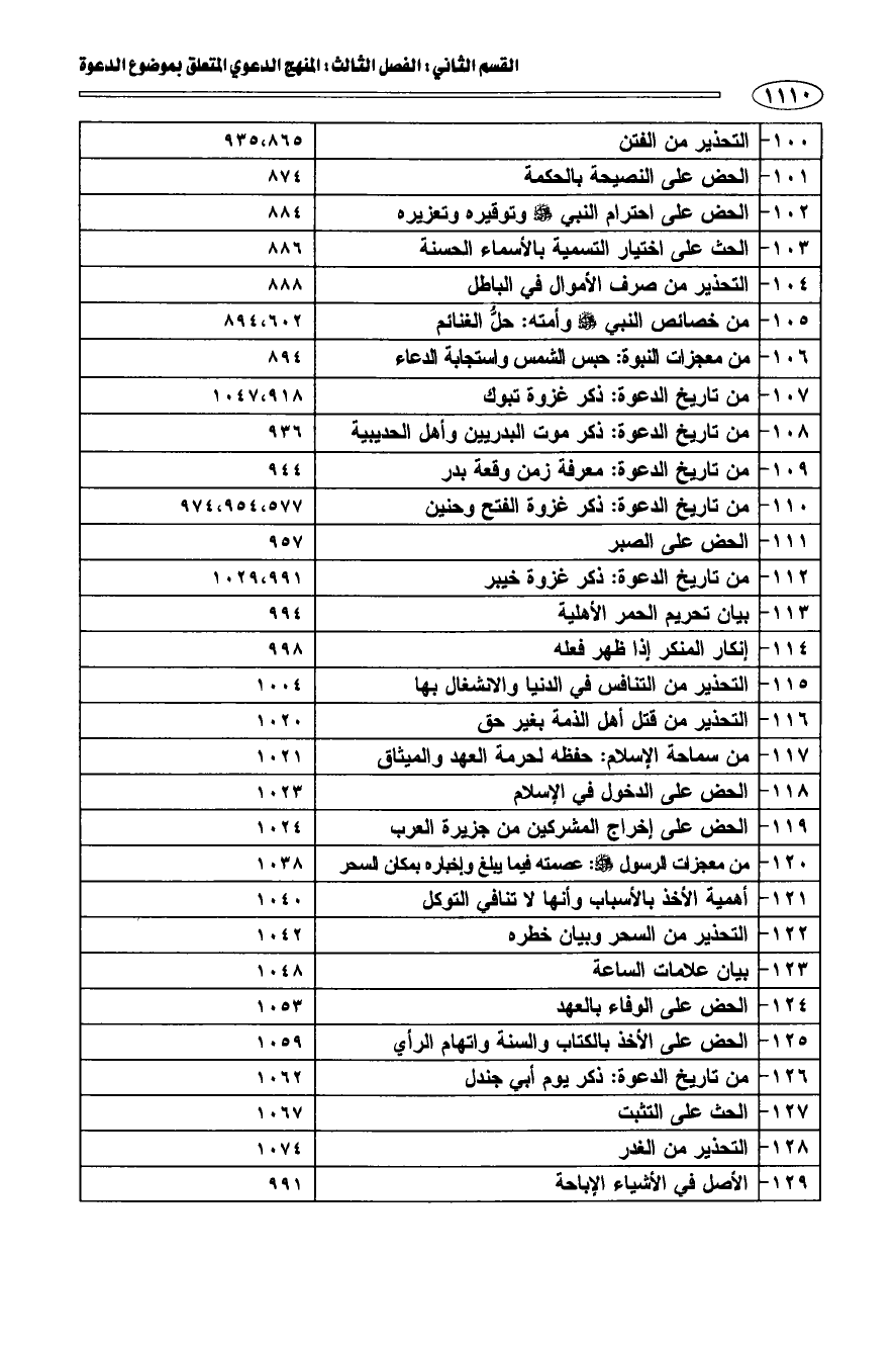 100 - التحذير من الفتن 685، 935 101 الحض على النصيحة بالحكم 874 102 الحض على احترام النبي صلي الله عليه وسلم وتوقيره وتعزيزه 884 103 الحث على اختيار التسمية بالأسماء الحسنة 886 104 التحذير من صرف الأموال في الباطل 888 105 من خصائص النبي صلي الله عليه وسلم وأمته: حل الغنائم 602، 894 106 من معجزات النبوة: حبس الشمس واستجابة الدعاء 894 107 من تاريخ الدعوة: ذكر غزوة تبوك 918، 1047 108 من تاريخ الدعوة: ذكر موت البدريين وأهل الحديبية 936 109 من تاريخ الدعوة: معرفة زمن وقعة بدر 944 110 من تاريخ الدعوة: ذكر غزوة الفتح وحنين 577، 954، 974 111 الحض على الصبر 957 112 من تاريخ الدعوة: ذكر غزوة خيبر 991، 1029 113 بيان تحريم الحمر الأهلية 994 114 إنكار المنكر إذا ظهر فعله 998 115 التحذير من التنافس في الدنيا والانشغال بها 1004 116 التحذير من قتل أهل الذمة بغير حق 1020 117 من سماحة الإسلام: حفظه لحرمة العهد والميثاق 1021 118 الحض على الدخول في الإسلام 1023 119 الحض على إخراج المشركين من جزيرة العرب 1024 120 من معجزات الرسول صلي الله عليه وسلم عصمته فيما يبلغه وإخباره بمكان السحر 1038 121 أهمية الأخذ بالأسباب وأنها لا تنافي التوكل 1040 122 التحذير من السحر وبيان خطره 1042 123 بيان علامات الساعة 1048 124 الحض على الوفاء بالعهد 1053 125 الحض على الأخذ بالكتاب والسنة 1059 126 من تاريخ الدعوة: ذكر يوم أبي الجندل 1062 127 الحث على التثبت 1067 128 التحذير من الغدر 1074 129 الأصل في الأشياء الإباحة 991