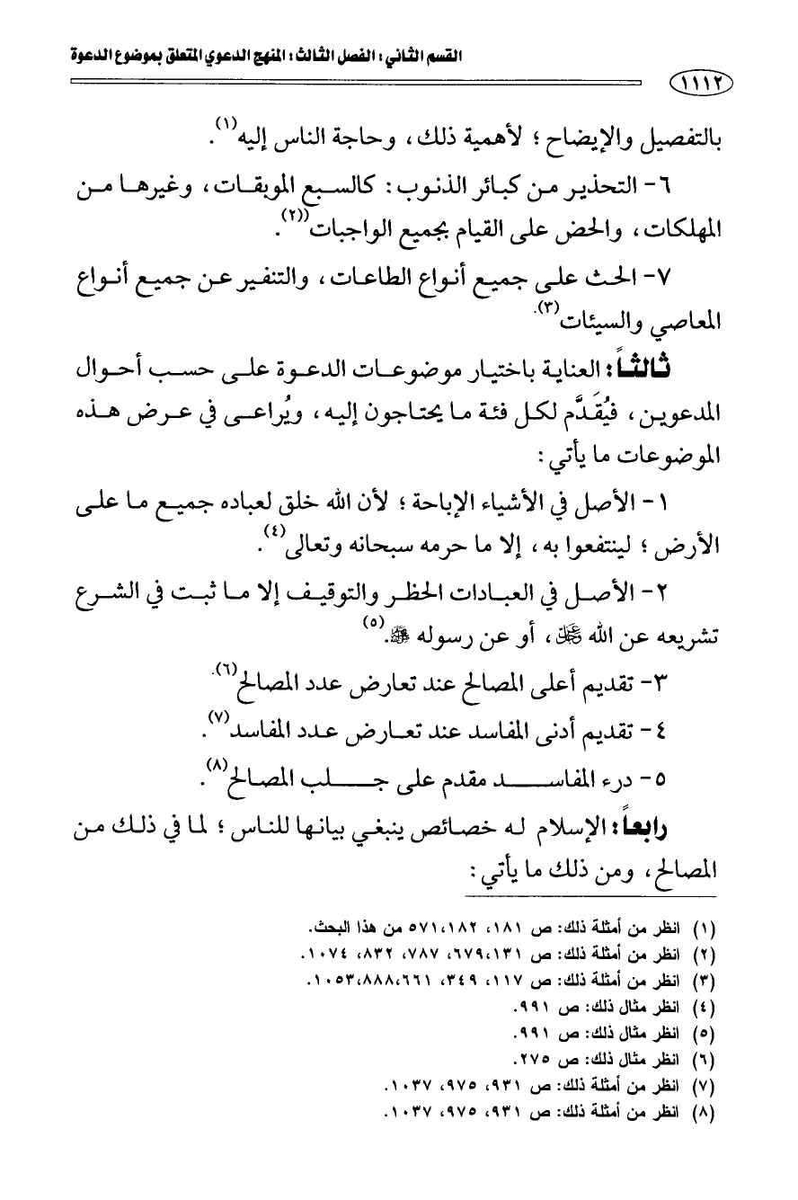 ثالثا: العناية باختيار موضوعات الدعوة على حسب أحوال المدعوين، فيقدم لكل فئة ما يحتاجون إليه، ويراعى في عرض هذه الموضوعات ما يأتي: