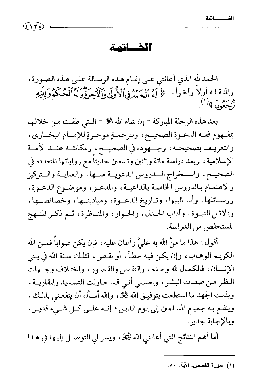 بعد هذه الرحلة المباركة - إن شاء الله عز وجل - التي طفت من خلالها بمفهوم فقه الدعوة الصحيح، وبترجمة موجزة للإمام البخاري، والتعريف بصحيحه، وجهوده في الصحيح، ومكانته عند الأمة الإسلامية، وبعد دراسة مائة واثنين وتسعين حديثا مع رواياتها المتعددة في الصحيح، واستخراج الدروس الدعوية منها، والعناية والتركيز والاهتمام بالدروس الخاصة بالداعية، والمدعو، وموضوع الدعوة، ووسائلها، وأساليبها، وتاريخ الدعوة، وميادينها، وخصائصها، ودلائل النبوة، وآداب الجدل، والحوار، والمناظرة، ثم ذكر المنهج المستخلص من الدراسة.
