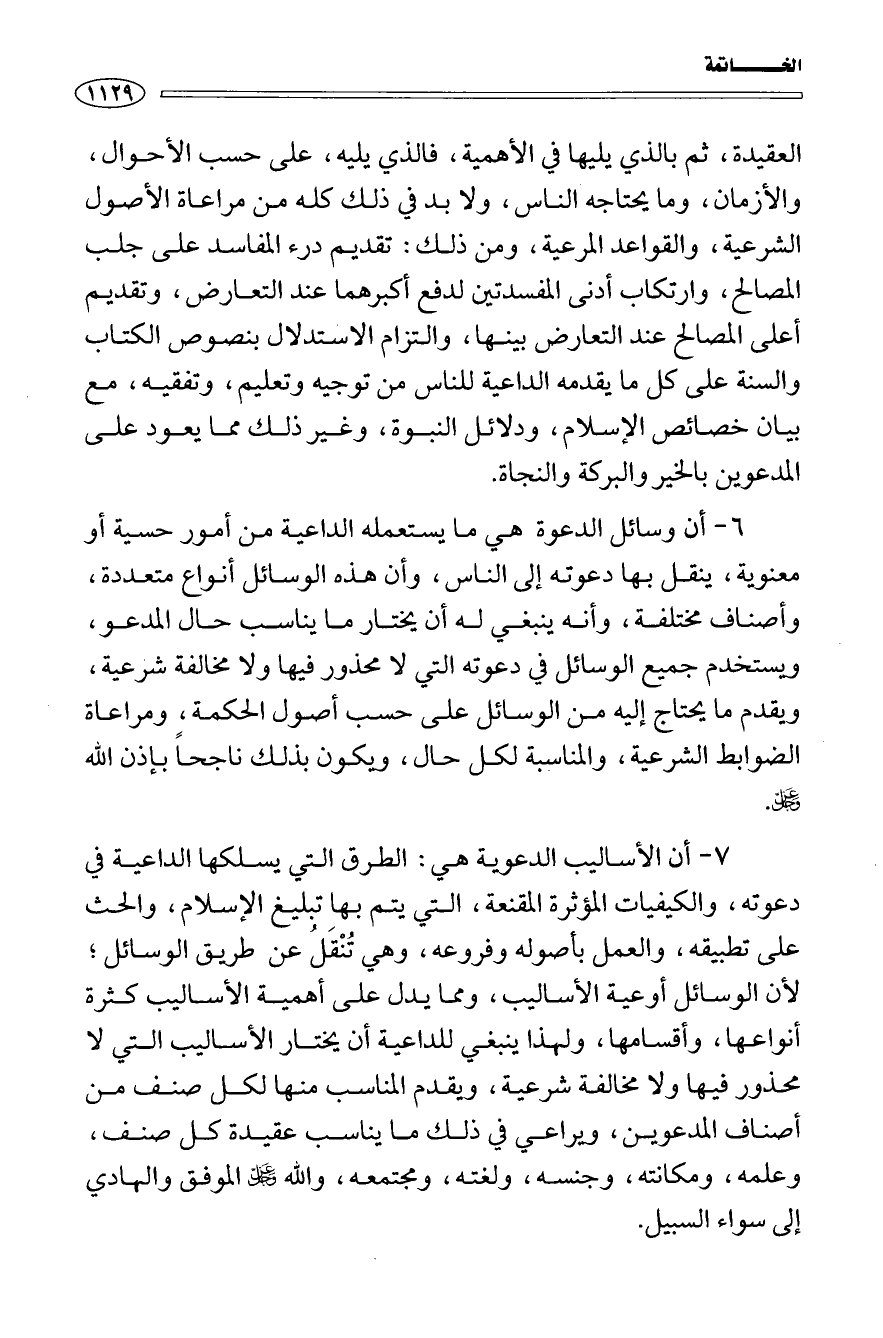 6 - أن وسائل الدعوة هي ما يستعمله الداعية من أمور حسية أو معنوية، ينقل بها دعوته إلى الناس، وأن هذه الوسائل أنواع متعددة، وأصناف مختلفة، وأنه ينبغي له أن يختار ما يناسب حال المدعو، ويستخدم جميع الوسائل في دعوته التي لا محذور فيها ولا مخالفة شرعية، ويقدم ما يحتاج إليه من الوسائل على حسب أصول الحكمة، ومراعاة الضوابط الشرعية، والمناسبة لكل حال، ويكون بذلك ناجحا بإذن الله عز وجل.