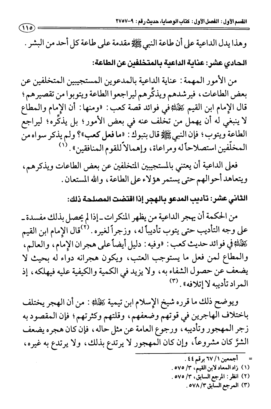 الحادي عشر: عناية الداعية بالمتخلفين عن الطاعة: من الأمور المهمة: عناية الداعية بالمدعوين المستجيبين المتخلفين عن بعض الطاعات، فيرشدهم ويذكِّرهم ليراجعوا الطاعة ويتوبوا من تقصيرهم؛ قال الإمام ابن القيم رحمه الله في فوائد قصة كعب: " ومنها: أن الإمام والمطاع لا ينبغي له أن يهمل من تخلف عنه في بعض الأمور؛ بل يذكِّره؛ ليراجع الطاعة ويتوب؛ فإن النبي صلى الله عليه وسلم قال بتبوك: " ما فعل كعب "؟ ولم يذكر سواه من المخلَّفين استصلاحا له ومراعاة، وإهمالا للقوم المنافقين " (¬1).