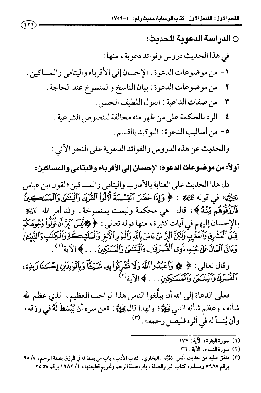 أولا: من موضوعات الدعوة: الإحسان إلى الأقرباء واليتامى والمساكين: دل هذا الحديث على العناية بالأقارب واليتامى والمساكين؛ لقول ابن عباس رضي الله عنهما في قوله عز وجل: {وَإِذَا حَضَرَ الْقِسْمَةَ أُولُو الْقُرْبَى وَالْيَتَامَى وَالْمَسَاكِينُ فَارْزُقُوهُمْ مِنْهُ} [النساء: 8] قال: هي محكمة وليست بمنسوخة. وقد أمرِ الله عز وجل بالإحسان إليهم في آيات كثيرة، منها قوله تعالى: