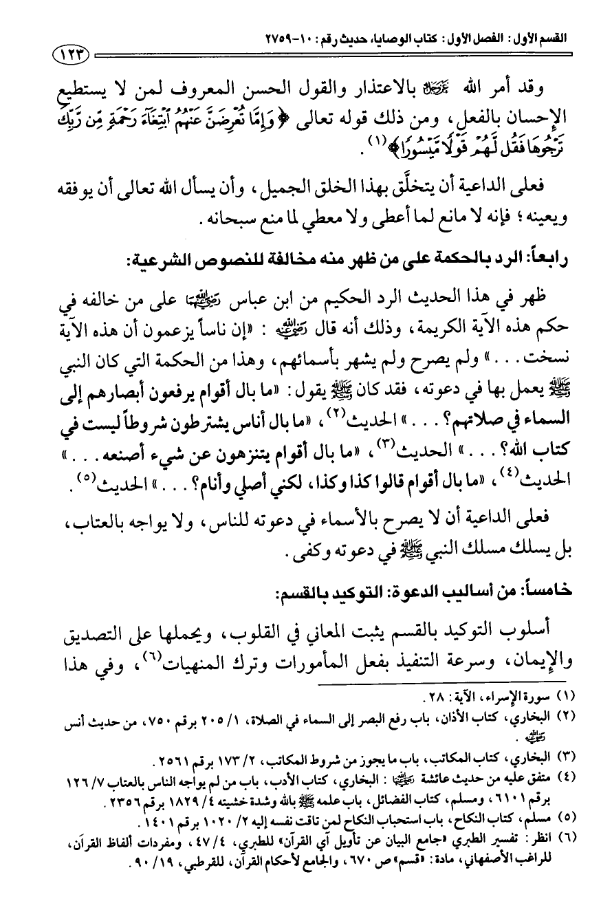 خامسا: من أساليب الدعوة: التوكيد بالقسم: أسلوب التوكيد بالقسم يثبت المعاني في القلوب، ويحملها على التصديق والإيمان، وسرعة التنفيذ بفعل المأمورات وترك المنهيات (¬6) وفي هذا