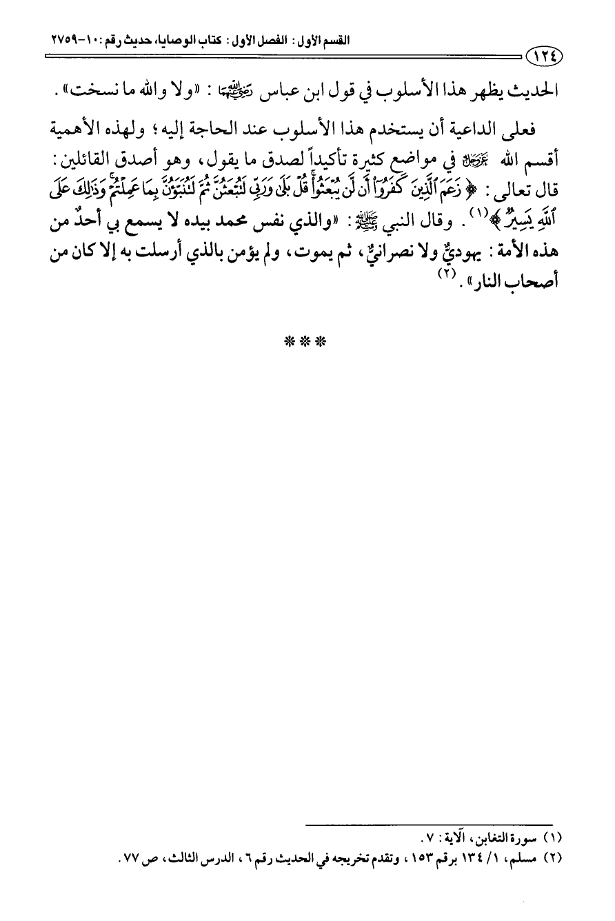 الحديث يظهر هذا الأسلوب في قول ابن عباس رضي الله عنهما: " ولا والله ما نسخت ". فعلى الداعية أن يستخدم هذا الأسلوب عند الحاجة إليه؛ ولهذه الأهمية أقسم الله عز وجل في مواضع كثيرة تأكيدا لصدق ما يقول، وهو أصدق القائلين: قال تعالى: {زَعَمَ الَّذِينَ كَفَرُوا أَنْ لَنْ يُبْعَثُوا قُلْ بَلَى وَرَبِّي لَتُبْعَثُنَّ ثُمَّ لَتُنَبَّؤُنَّ بِمَا عَمِلْتُمْ وَذَلِكَ عَلَى اللَّهِ يَسِيرٌ} [التغابن: 7] (¬1) وقال النبي صلى الله عليه وسلم: «والذي نفس محمد بيده لا يسمع بي أحد من هذه الأمة: يهوديّ ولا نصرانيّ، ثم يموت، ولم يؤمن بالذي أرسلت به إلا كان من أصحاب النار» (¬2).