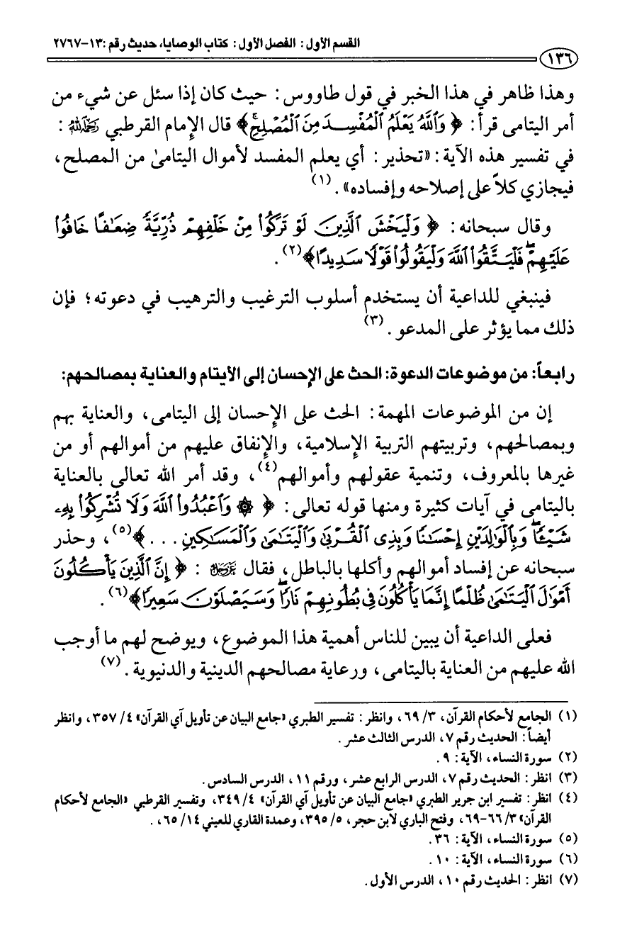 وهذا ظاهر في هذا الخبر في قول طاووس: حيث كان إذا سئل عن شيء من أمر اليتامى قرأ: {وَاللَّهُ يَعْلَمُ الْمُفْسِدَ مِنَ الْمُصْلِحِ} [البقرة: 220] قال الإمام القرطبي رحمه الله: في تفسير هذه الآية: " تحذير: أي يعلم المفسد لأموال اليتامى من المصلح، فيجازي كلا على إصلاحه وإفساده " (¬1).
