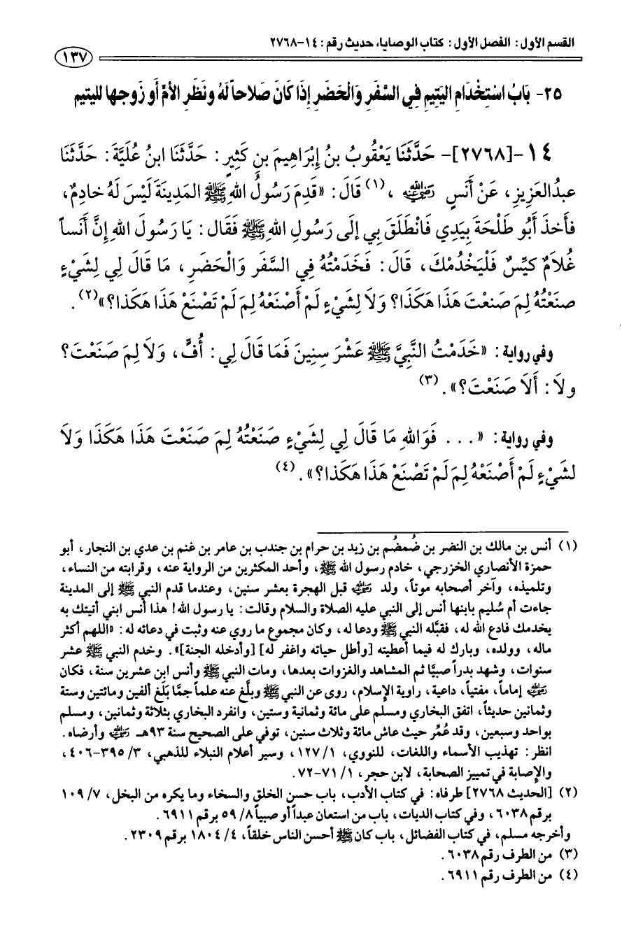 ". . . «فَوَاللهِ مَا قَالَ لِي لِشَيْءٍ صَنَعْته لِمَ صَنَعْتَ هَذَا هَكَذَا وَلاَ لشيء لَمْ أَصْنَعْه لِمَ لَمْ تَصْنَعْ هَذَا هَكَذا؟» (¬4).