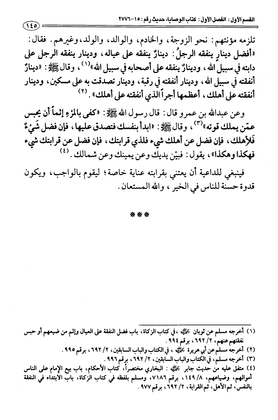 (¬1) أخرجه مسلم عن ثوبان رضي الله عنه، في كتاب الزكاة، باب فضل النفقة على العيال وإثم من ضيعهم أو حبس نفقتهم عنهم، 2/ 692، برقم 994.