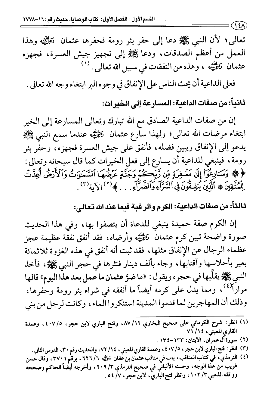 ثانيا: من صفات الداعية: المسارعة إلى الخيرات: إن من صفات الداعية الصادق مع الله تبارك وتعالى المسارعة إلى الخير ابتغاء مرضات الله تعالى؛ ولهذا سارع عثمان رضي الله عنه عندما سمع النبي صلى الله عليه وسلم يدعو إلى الإنفاق ويبين فضله، فأنفق على جيش العسرة فجهزه، وحفر بئر رومة، فينبغي للداعية أن يسارع إلى فعل الخيرات كما قال سبحانه وتعالى: {وَسَارِعُوا إِلَى مَغْفِرَةٍ مِنْ رَبِّكُمْ وَجَنَّةٍ عَرْضُهَا السَّمَاوَاتُ وَالْأَرْضُ أُعِدَّتْ لِلْمُتَّقِينَ - الَّذِينَ يُنْفِقُونَ فِي السَّرَّاءِ وَالضَّرَّاءِ} [آل عمران: 133 - 134] (¬2) الآية (¬3).