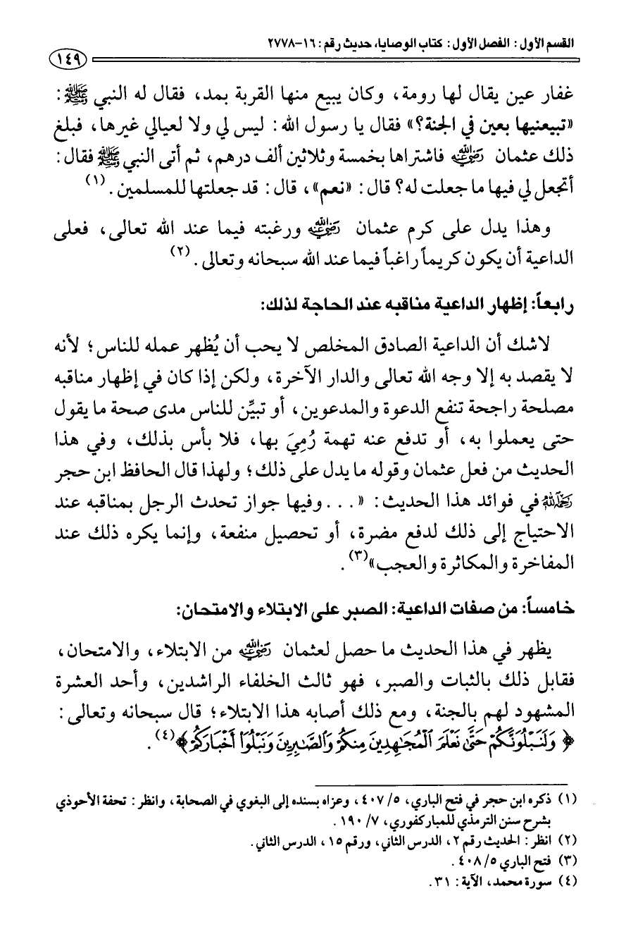 خامسا: من صفات الداعية: الصبر على الابتلاء والامتحان: يظهر في هذا الحديث ما حصل لعثمان رضي الله عنه من الابتلاء، والامتحان، فقابل ذلك بالثبات والصبر، فهو ثالث الخلفاء الراشدين، وأحد العشرة المشهود لهم بالجنة، ومع ذلك أصابه هذا الابتلاء؛ قال سبحانه وتعالى: {وَلَنَبْلُوَنَّكُمْ حَتَّى نَعْلَمَ الْمُجَاهِدِينَ مِنْكُمْ وَالصَّابِرِينَ وَنَبْلُوَ أَخْبَارَكُمْ} [محمد: 31] (¬4).