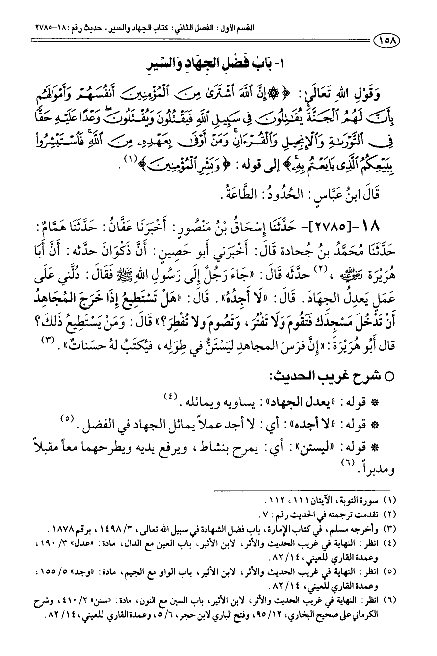 18 - [2785] حَدَّثَنَا إِسْحَاق بْن مَنْصورٍ: أَخْبَرَنَا عَفَّان: حَدَّثَنَا هَمَّام: حَدَّثَنَا محَمَّد بن جحادة قَال: أخْبَرَني أَبو حَصِينٍ: أَنَّ ذَكْوانَ حدَّثه: أن أبَا هرَيْرَة رضي الله عنه (¬2) حدَّثَه قالَ: «جَاءَ رَجل إِلَى رسولِ اللهِ صلى الله عليه وسلم فَقَالَ: دلَّني عَلَى عَمَلٍ يَعدِل الجِهَادَ. قالَ: " لَا أَجِده ". قَالَ: " هَل تَسْتَطِيع إِذَا خَرَجَ المجَاهِد أَنْ تَدْخلَ مَسجِدَكَ فَتَقومَ وَلَا تَفْترَ، وَتَصومَ ولا تفْطِرَ؟ " قَالَ: وَمَنْ يَسْتَطِيع ذَلكَ؟ قال أَبو هرَيْرَةَ: " إنَّ فرَسَ المجاهدِ ليَسْتَنّ في طِوَلِه، فيكتَب له حسَنات» (¬3).
