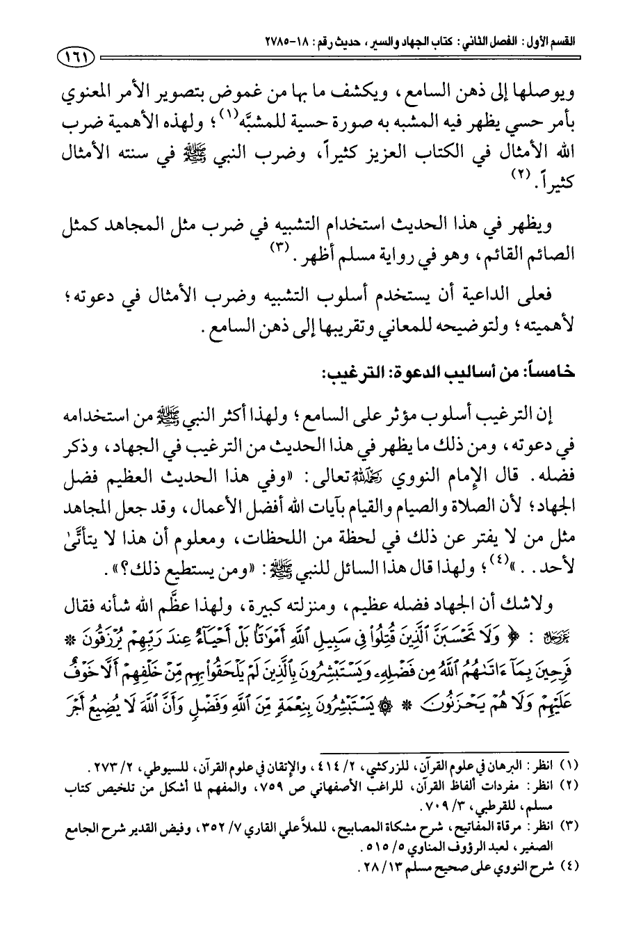 ويوصلها إلى ذهن السامع، ويكشف ما بها من غموض بتصوير الأمر المعنوي بأمر حسي يظهر فيه المشبه به صورة حسية للمشبَّه (¬1) ولهذه الأهمية ضرب الله الأمثال في الكتاب العزيز كثيرا، وضرب النبي صلى الله عليه وسلم في سنته الأمثال كثيرا (¬2) ويظهر في هذا الحديث استخدام التشبيه في ضرب مثل المجاهد كمثل الصائم القائم، وهو في رواية مسلم أظهر (¬3).