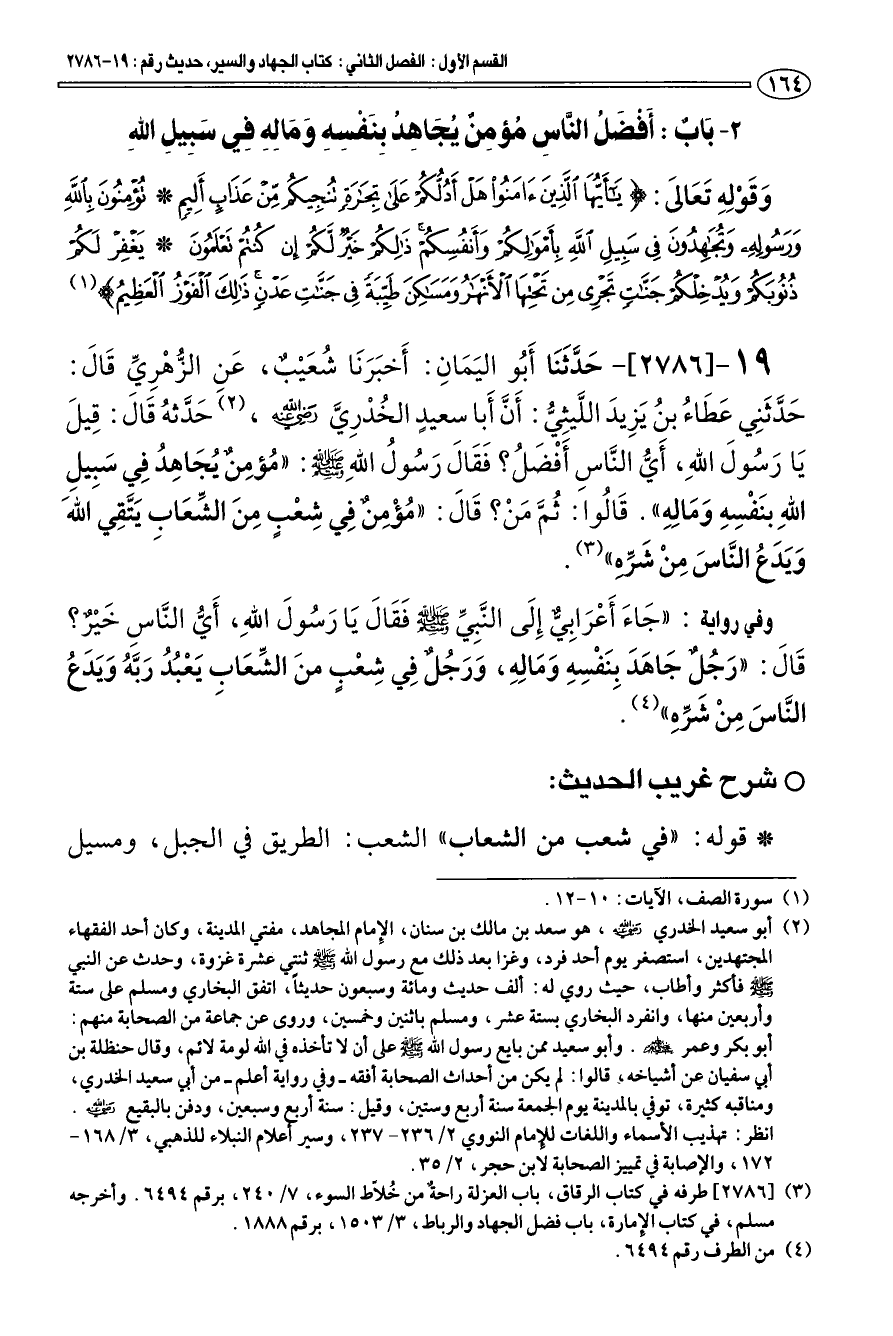 19 - [2786] حَدَّثَنَا أَبو اليَمَانِ: أَخبَرَنَا شعَيْب، عَنِ الزّهْرِيِّ قَالَ: حَدَّثَنِي عَطَاء بن يَزِيدَ اللَّيثِيّ: أَنَّ أَبا سعيدٍ الخدْرِيَّ رضي الله عنه (¬2) حَدَّثه قَالَ: «قِيلَ يَا رَسولَ اللهِ، أَيّ النَّاسِ أَفْضَل؟ فَقَالَ رَسول اللهِ صلى الله عليه وسلم: " مؤمِن يجَاهِد فِي سَبِيلِ اللهِ بنَفْسِهِ وَمَالِهِ ". قَالوا: ثمَّ مَنْ؟ قَالَ: " مؤْمِن فِي شِعْبٍ مِنَ الشِّعَابِ يَتَّقِي اللهَ وَيدَع النَّاسَ مِنْ شَرِّهِ» (¬3).